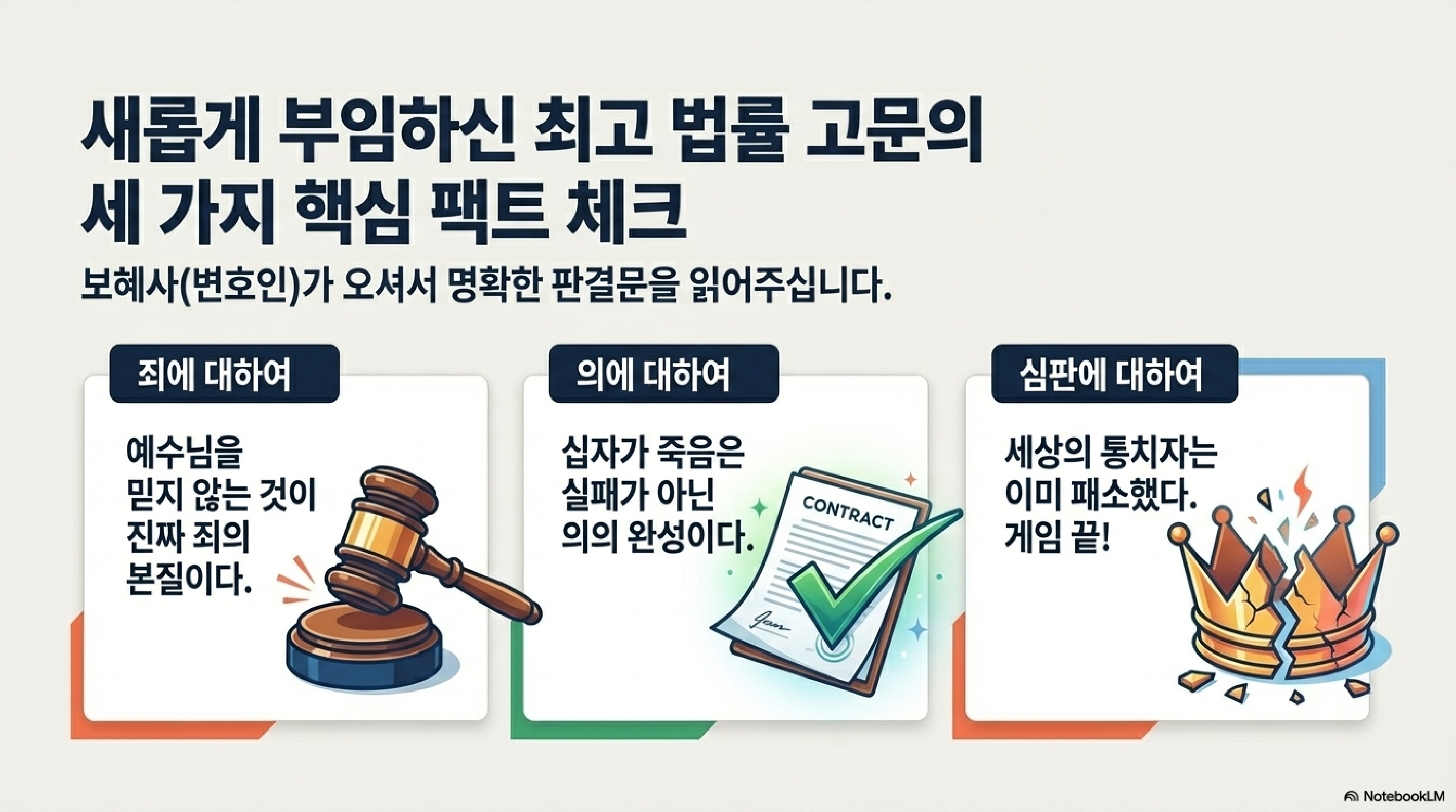 _ 죄에 대하여:_ 이제 죄의 정의가 바뀝니다. "나를 믿지 않는 것"이 죄입니다(v.9). 우량주인 예수라는 핵심 자산을 포트폴리오에 담지 않은 것 자체가 가장 큰 리스크이자 잘못이라는 지적입니다. _ 의에 대하여:_ 예수님이 아버지께로 가셔서 더 이상 보이지 않는 것이 '의'의 증거가 됩니다(v.10). 이건 일종의 '실적 증명'입니다. 설계자가 현장에 없어도 시스템이 완벽하게 돌아가게 만든, 그 완벽한 가치의 증명인 셈이죠. _ 심판에 대하여:_ 이 세상의 통치자가 이미 심판을 받았기 때문입니다(v.11).