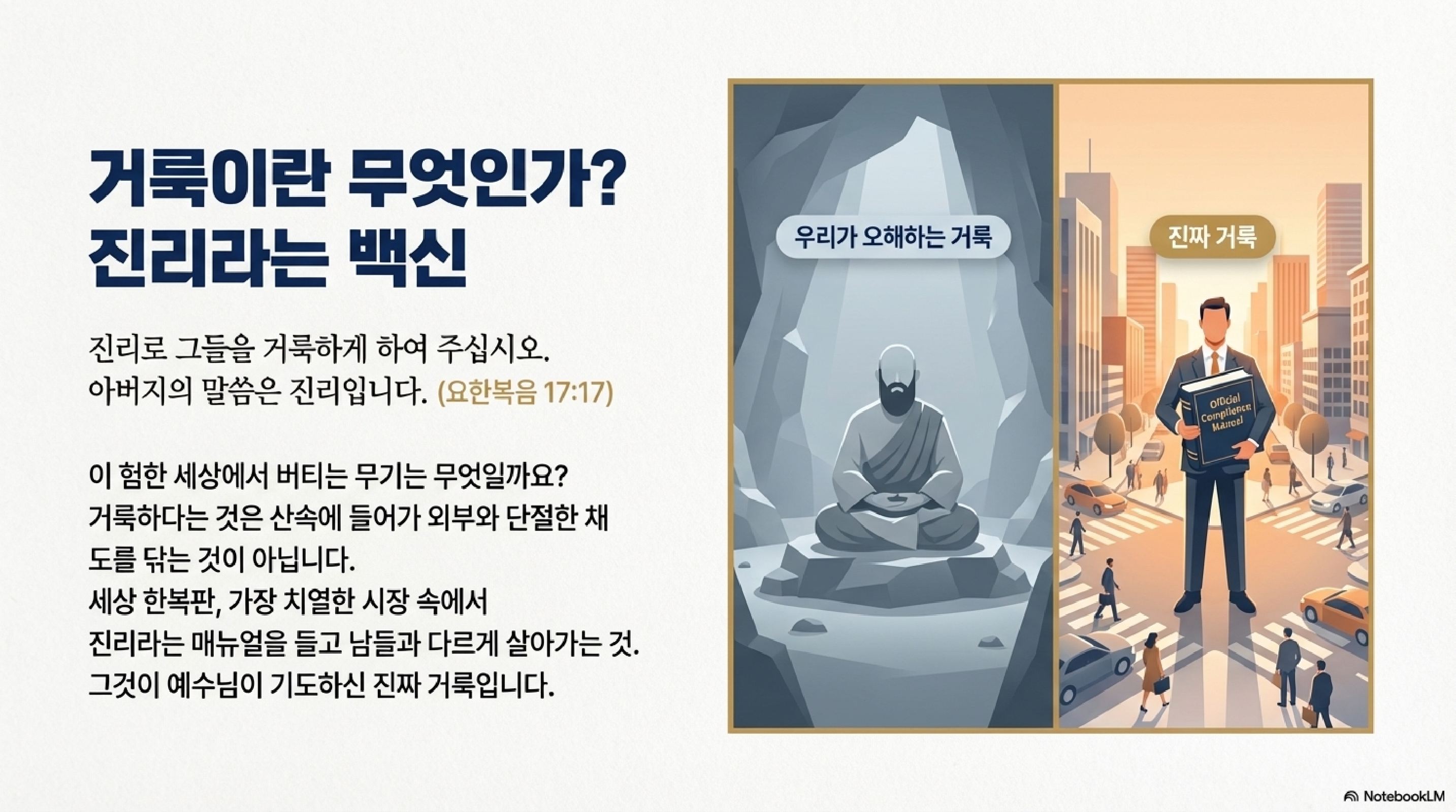 그렇다면 정체성이 확실한 제자들이 이 적대적인 시장에서 살아남기 위해 갖춰야 할 무기는 무엇일까요? 예수님은 17절에서 진리로 그들을 거룩하게 하여 주십시오라고 기도하십니다. 거룩이라는 단어를 너무 어렵게 생각하실 필요 없습니다. 이건 일종의 차별화된 제품 경쟁력입니다. 세상의 논리와 섞이지 않는 말씀이라는 절대 기준을 가질 때, 비로소 제자들은 시장에서 대체 불가능한 존재가 됩니다. 만약 이들이 진리를 잃고 세상과 똑같이 굴기 시작하면 그 순간 상품 가치는 사라지고 도태되는 것입니다.