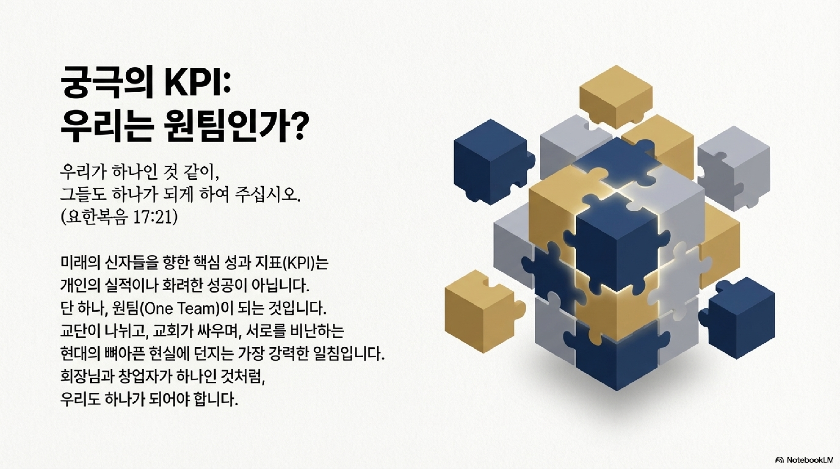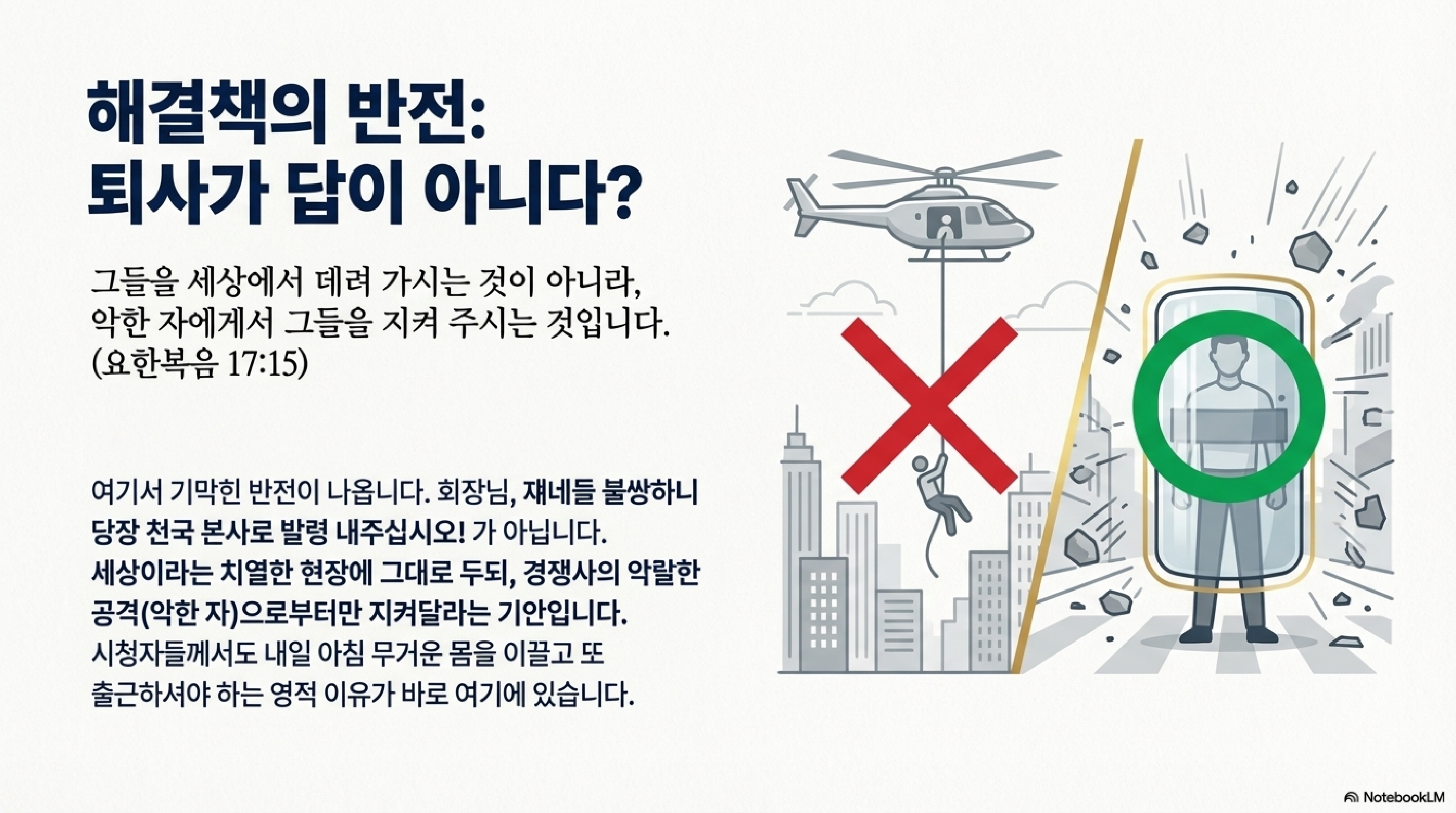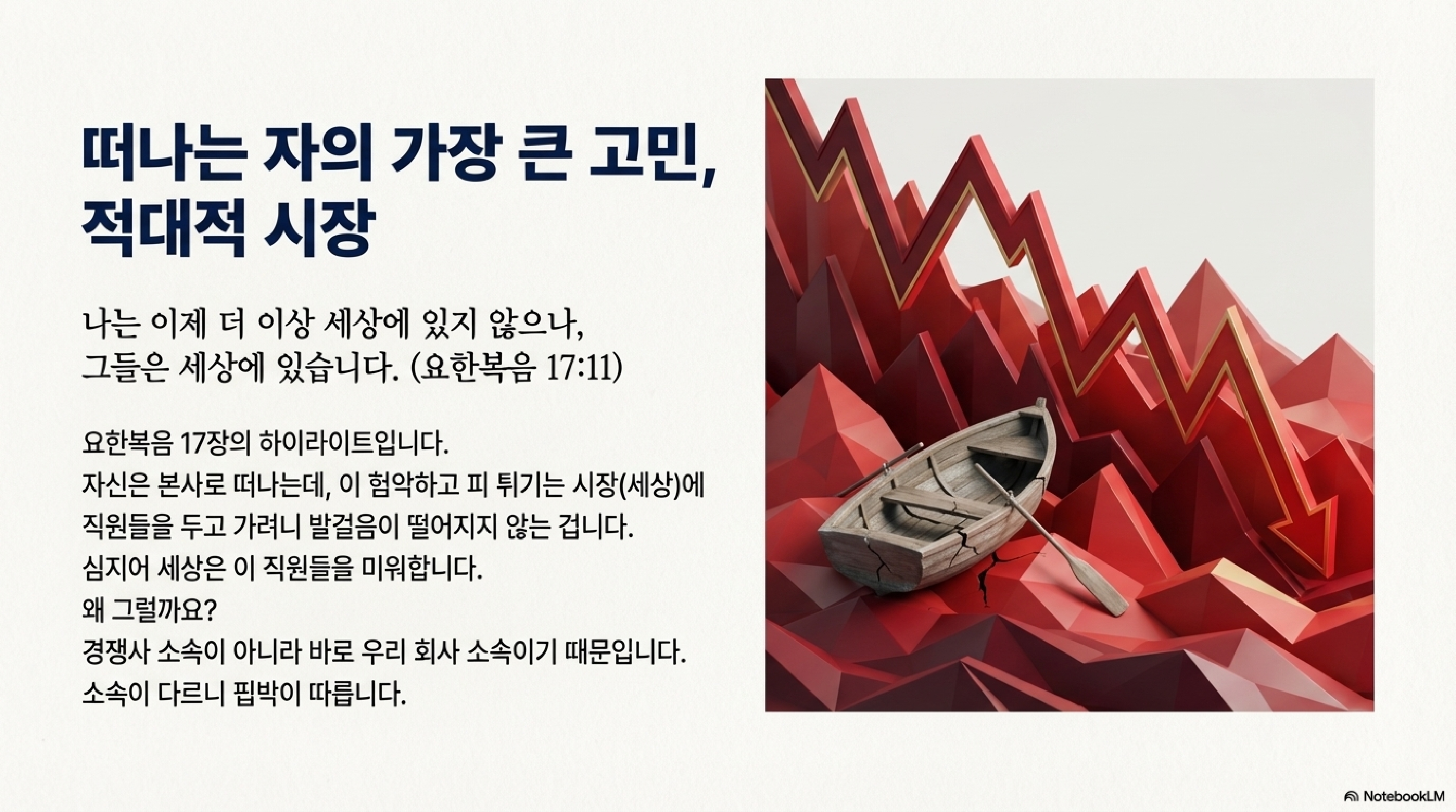 여기서 말하는 사랑은 말랑말랑한 감정적 유희가 아닙니다. 이건 척박한 세상이라는 전쟁터에서 파견직들이 버텨낼 수 있게 만드는 내부 자본이자 에너지원입니다. 세상은 여전히 제자들을 미워하고 시장 상황은 냉혹하지만, 서로를 묶어주는 강력한 사랑의 에너지, 즉 이 내부 결속력이 있을 때만 본사의 미션을 완수할 수 있기 때문입니다.