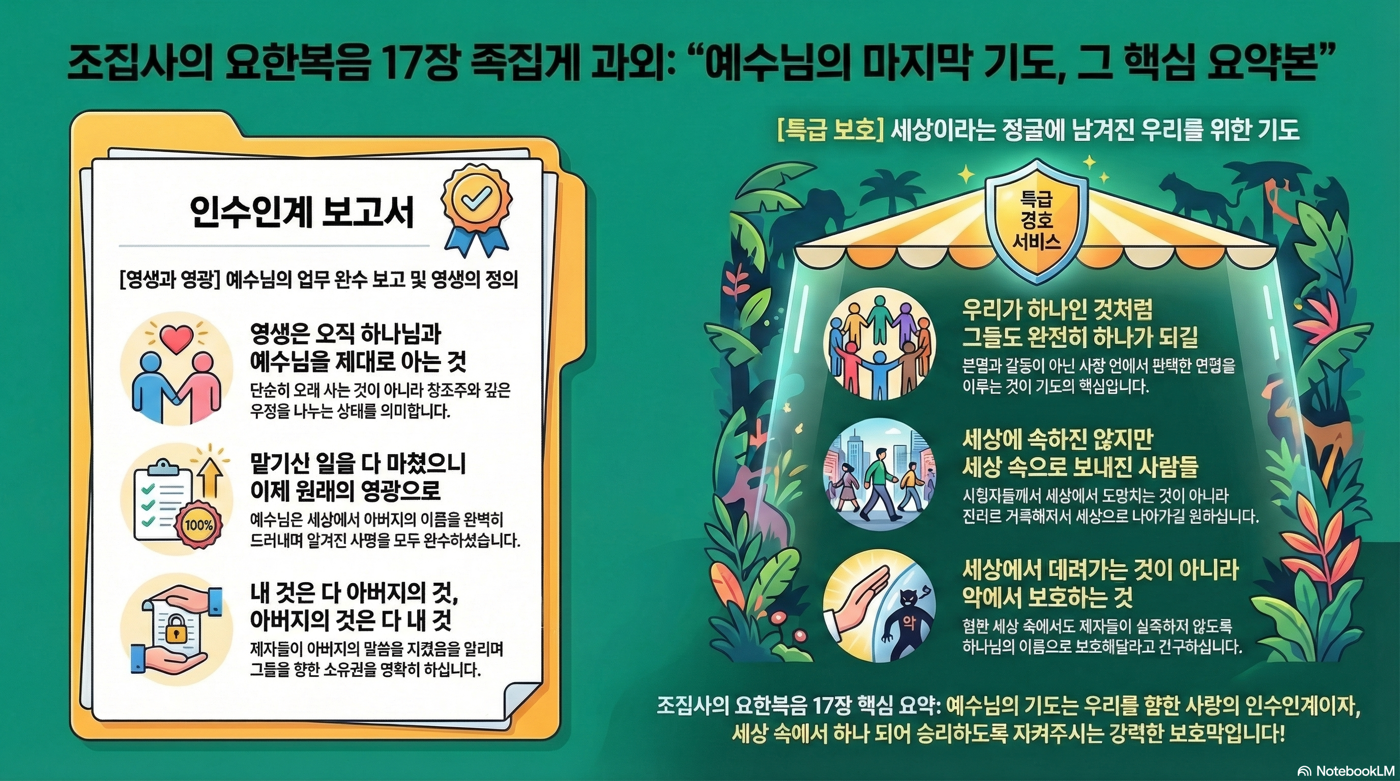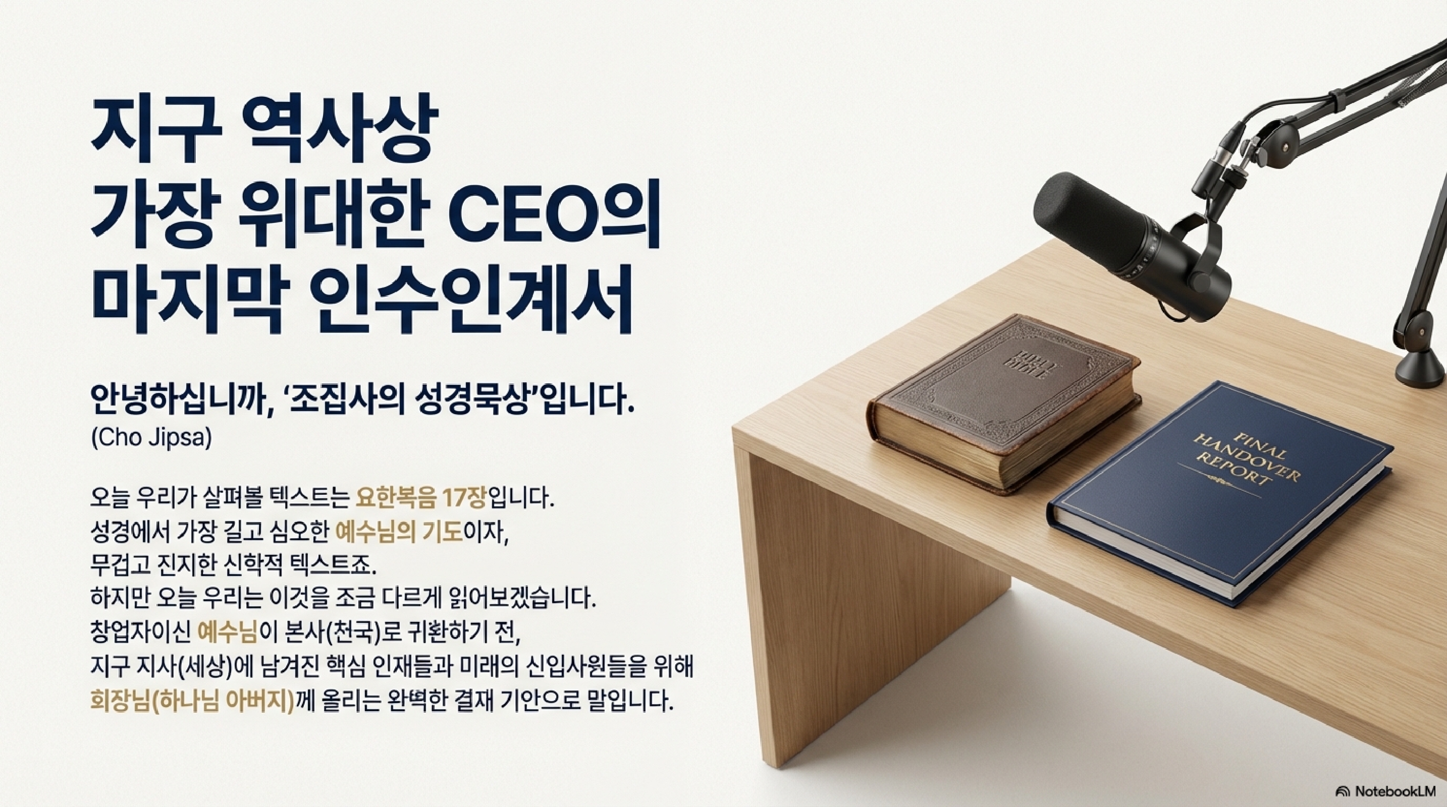 오늘 우리가 살펴볼 요한복음 17장은 성경 전체를 통틀어 가장 긴박하면서도 고도의 전략이 숨어있는 대목입니다. 이제 곧 십자가라는 거대한 사건을 마주해야 하는 예수님께서 제자들을 앞에 두고 하늘을 우러러보며 드리는 기도거든요. 시청자들께서 이 장면을 단순한 감성적 간구로 보시면 곤란합니다. 이건 일종의 최종 브리핑이자, 본사로 복귀하기 직전에 남기는 미션 완수 보고서에 가깝습니다.