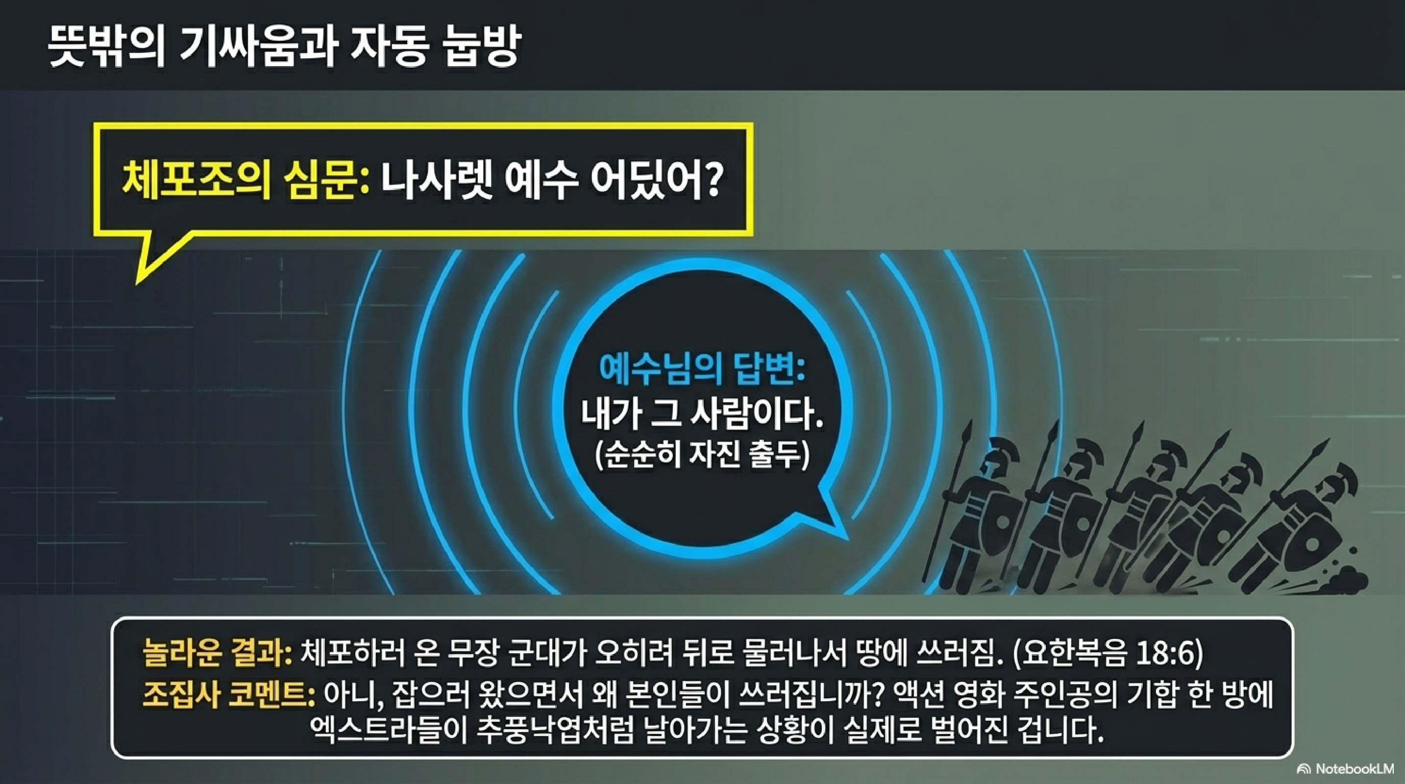 그런데 여기서 반전이 일어납니다. 예수님은 도망치기는커녕 본인에게 닥칠 일을 다 아시고는 앞으로 나서서 묻습니다. 너희는 누구를 찾느냐? 나사렛 예수라고 하니까 딱 한마디 하시죠. 내가 그 사람이다. 영어로는 I AM, 바로 하나님의 신적인 이름을 사용하신 겁니다. 이 말을 듣자마자 무장한 군인들이 뒷걸음질 치다 땅에 쓰러집니다. 예수님은 이 질문을 두 번이나 던지시며 상황의 주도권을 완전히 쥐고 계십니다. 겉으로는 칼과 창을 든 군대가 실세 같지만, 사실 이 현장의 템포를 조절하고 계신 건 예수님이라는 거죠.