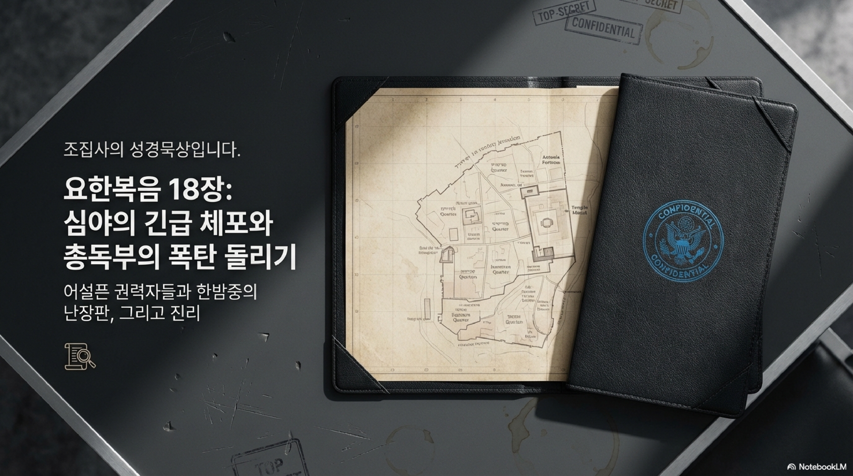 오늘 우리가 함께 들여다볼 현장은 요한복음 18장입니다. 흔히 '예수님의 체포'라고 하면 굉장히 무겁고 슬픈 장면만 떠올리실 텐데, 사실 이 장을 찬찬히 뜯어보면 한 편의 거대한 정치 스릴러가 따로 없습니다. 역대급 긴장감 속에서 벌어지는 고도의 정치적 수싸움, 그리고 그 안에서 드러나는 인간의 비겁함과 진정한 권력이 무엇인지가 아주 적나라하게 드러나거든요.