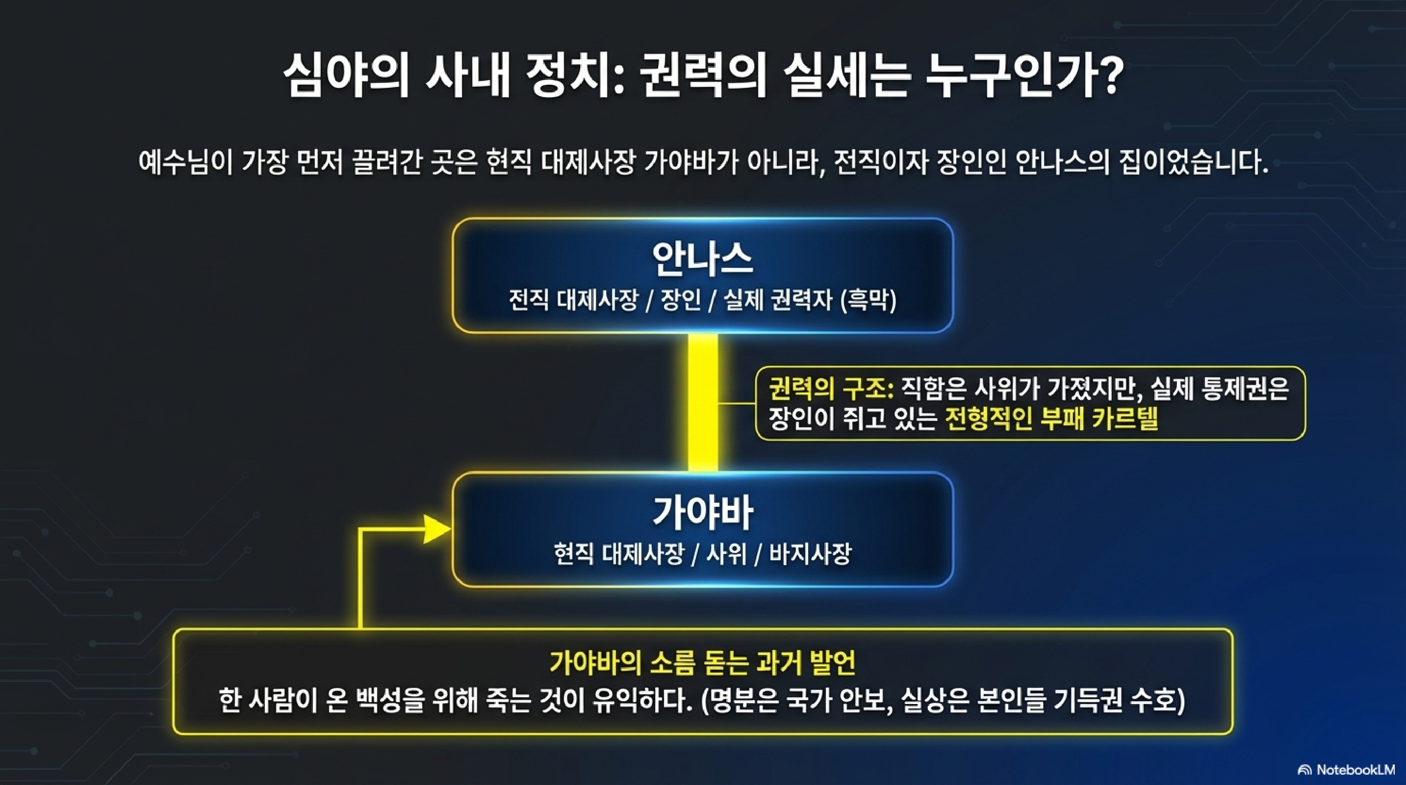 군대는 예수를 묶어 먼저 안나스에게로 끌고 갑니다. 안나스는 현직 대제사장 가야바의 장인인데, 실질적인 '비선 실세'이자 '상왕'입니다. 공식적인 법 절차보다 핏줄과 인맥이 앞서는 이 구조, 얼마나 전형적인 구태 정치입니까? 이들은 예수를 심문하며 기득권을 지키기 위한 명분 찾기에 혈안이 되어 있죠.