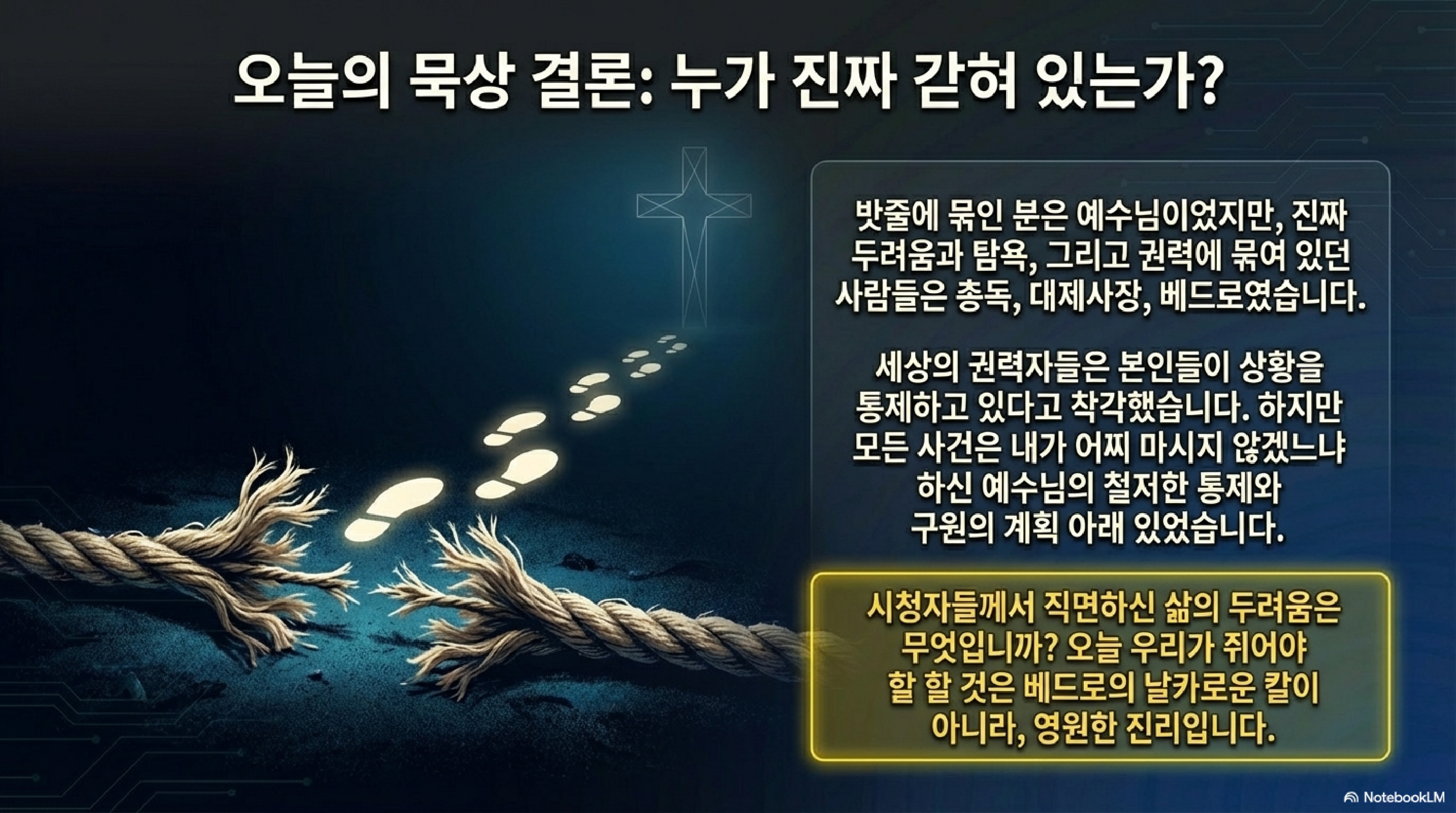안나스는 혈연으로 권력을 유지하려 했고, 빌라도는 진리를 알고도 커리어를 위해 눈을 감았으며, 베드로는 생존을 위해 사랑을 배신했습니다. 모두가 자기 한 몸 건사하려고 아등바등할 때, 오직 묶여 계신 예수님만이 가장 자유롭고 당당하게 진리를 말씀하십니다. 누가 진짜 인생의 주도권을 쥐고 있는지 다시 한번 생각해보게 만드는 대목이죠.