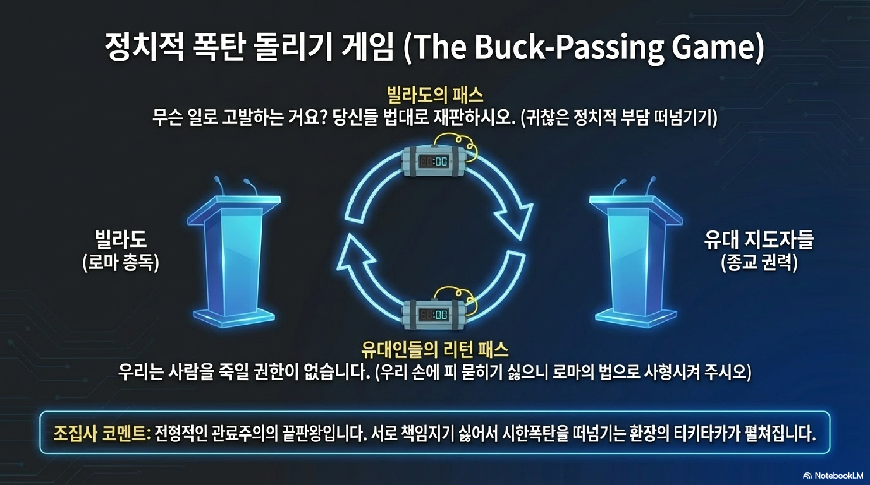 빌라도는 이 귀찮은 종교 분쟁에 휘말리기 싫어하는 전형적인 정치인입니다. 그는 유대인들에게 "당신들 법대로 처리하라"고 떠넘기지만, 유대인들은 "우리에겐 사람 죽일 권한이 없다"며 로마의 사형 제도를 무기화하려고 합니다. 아주 지독한 법리적 핑퐁 게임이죠.