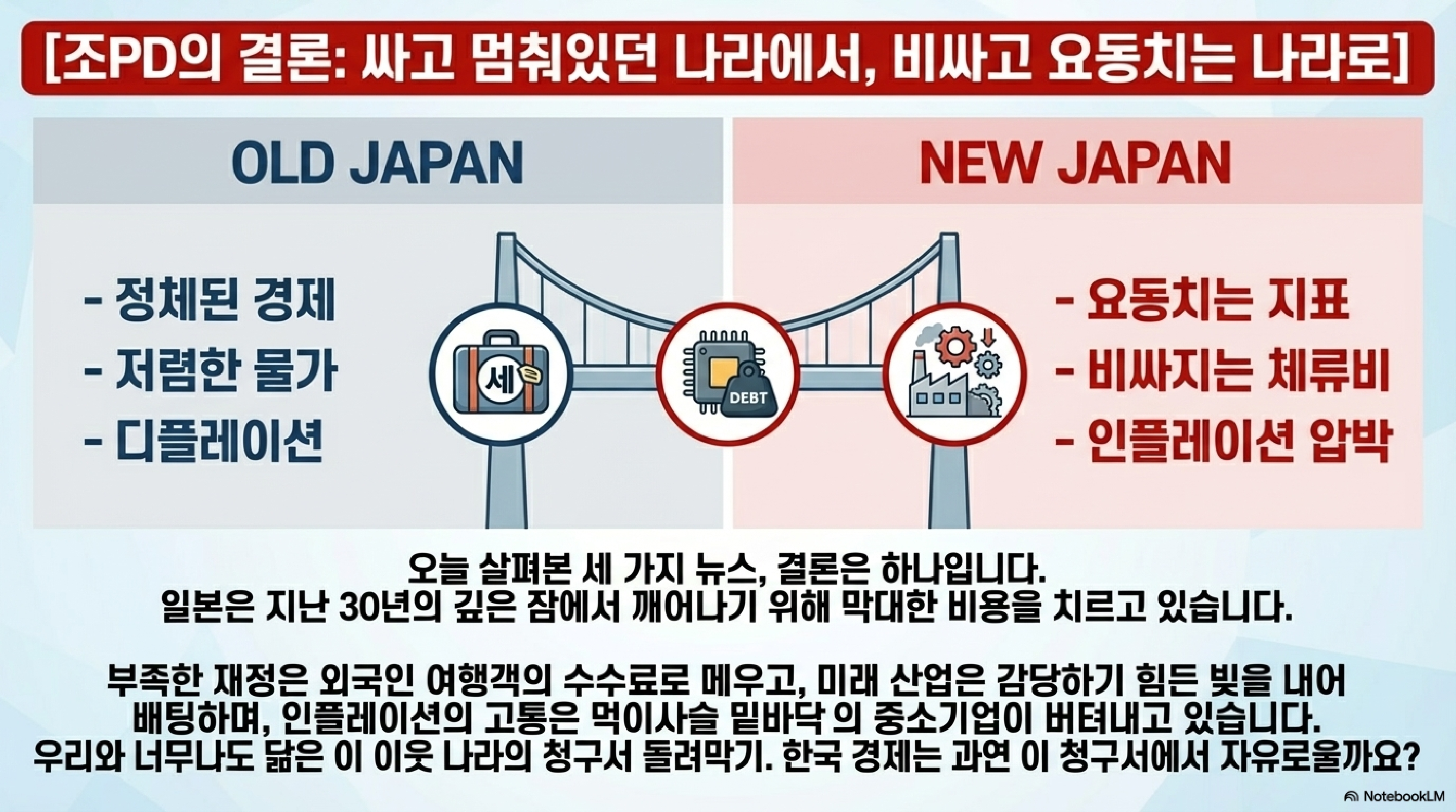 오늘 방송은 2026년 봄, 겉으로 보이는 엔저 관광 호황 이면에 숨겨진 일본 경제의 거대한 균열과 그들이 던진 마지막 승부수를 정밀 타격해보겠습니다. 한 문장으로 정의하자면 이렇습니다. '외풍에 떨고 내풍에 곪아버린 거인의 처절한 생존 게임'. 자, 시작합니다.