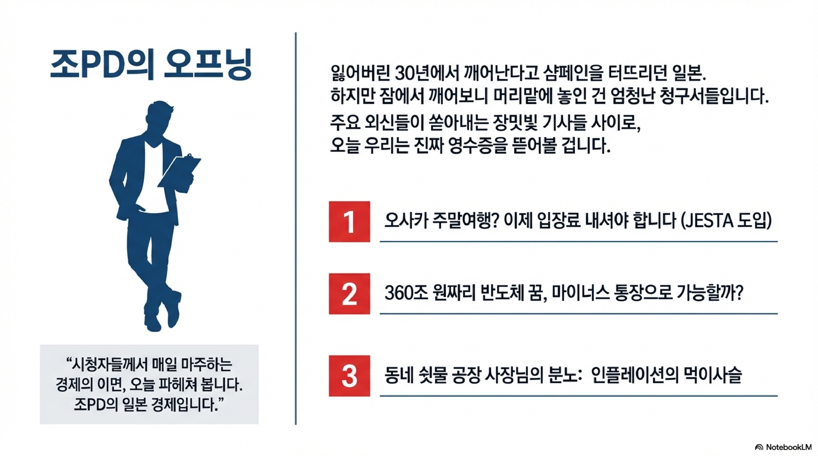 1. 오프닝: "조PD의 일본 경제"입니다