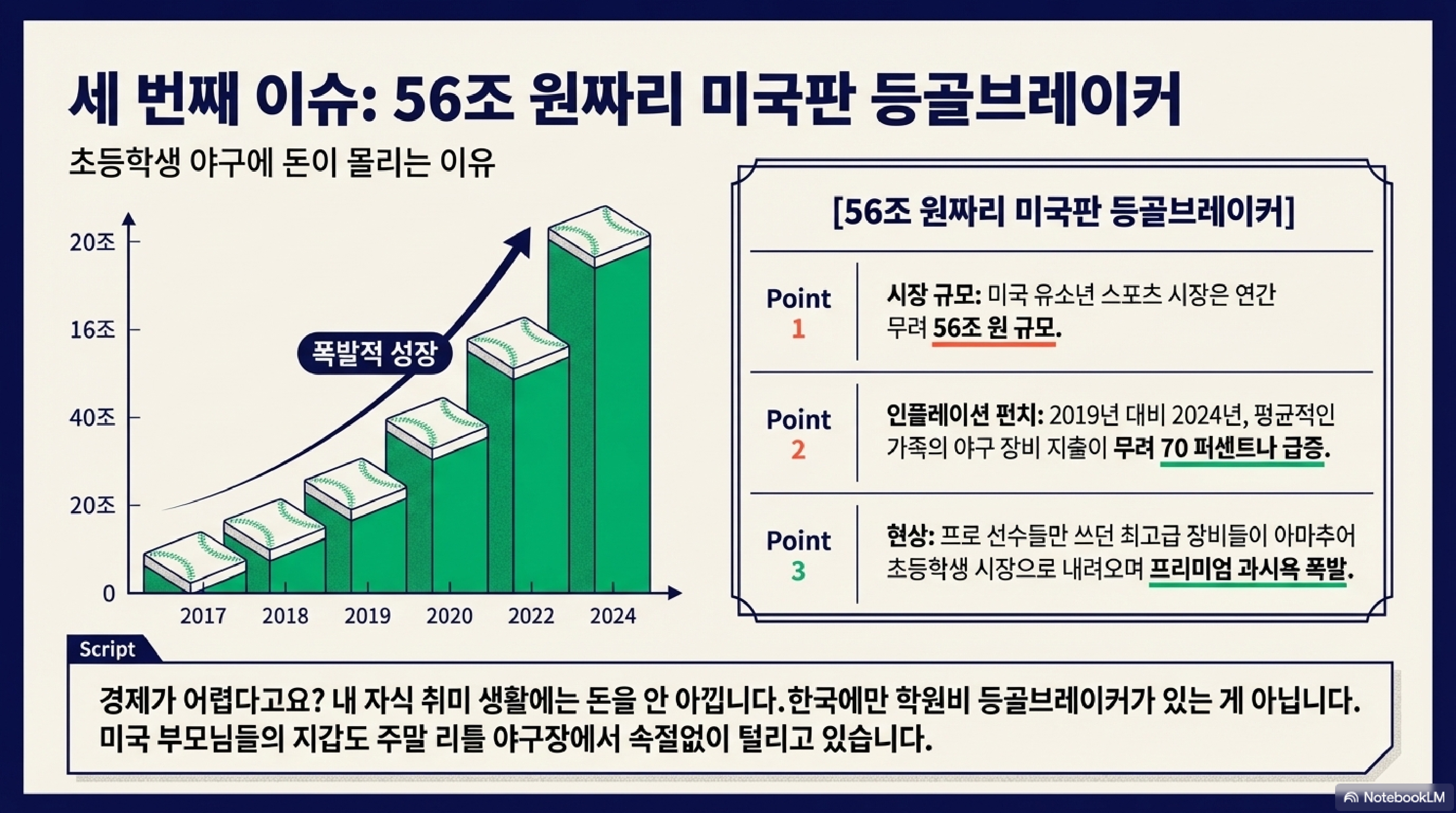 여기에 게임체인저(GameChanger)라는 앱은 아이들 경기 스탯을 중계해주며 연간 1억 5,000만 달러(약 1,980억 원)를 벌어들입니다. 부모들의 정신 건강에는 해로울지 몰라도 기업에는 황금 알을 낳는 거위인 셈입니다. 결국 혼란 속에서도 누군가는 부모의 지갑에서 돈을 빼내는 법을 정확히 알고 있습니다.