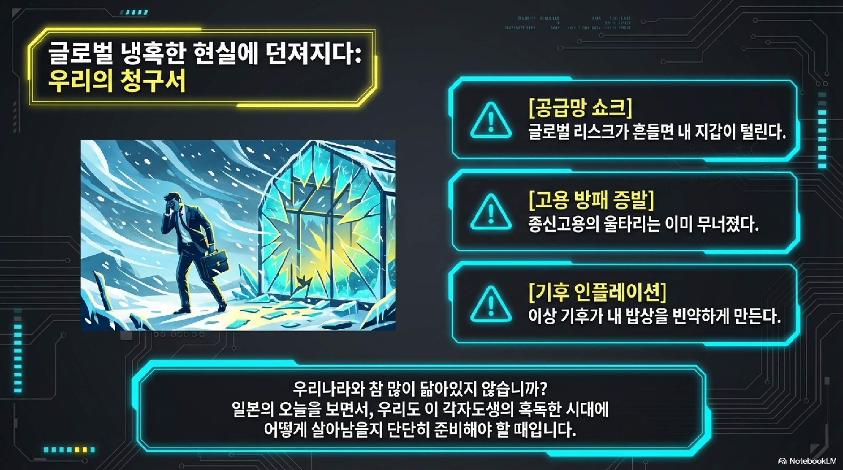 자, 오늘 이야기들을 정리해 봅시다. 밖으로는 중동 전쟁과 자원 전쟁에 시달리고, 안으로는 140년 된 고용 문화가 뿌리째 뽑히고 있습니다.