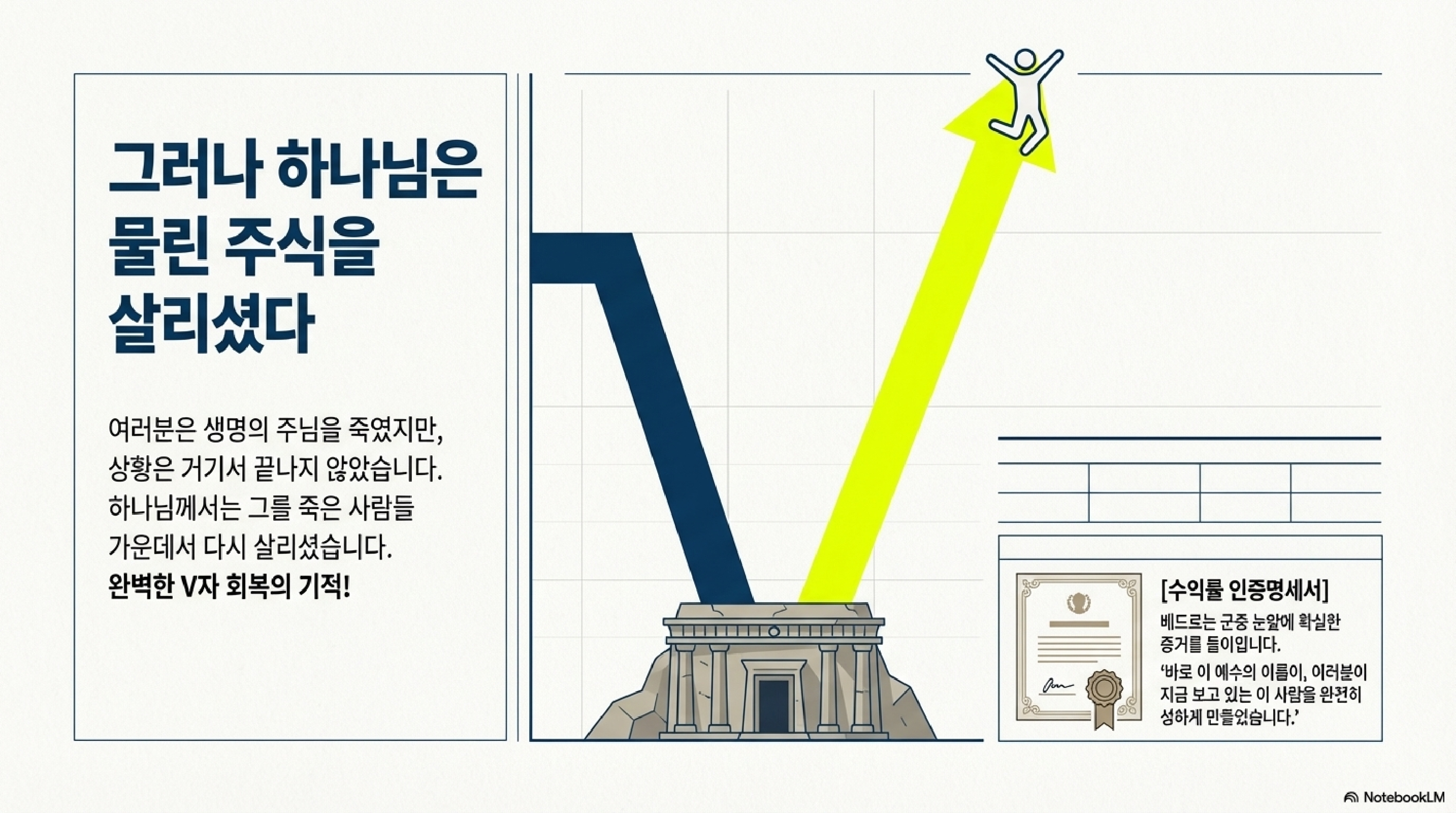 사도행전 3장이 오늘날 우리에게 주는 전략적 통찰은 명확합니다. 하나님이 우리에게 주시는 진정한 복은 주머니를 채워주는 동전 몇 푼이 아닙니다. 우리를 악에서 돌이키게 하여 삶의 근본적인 궤도를 수정하는 것, 그것이 가장 가치 있는 배당금입니다.