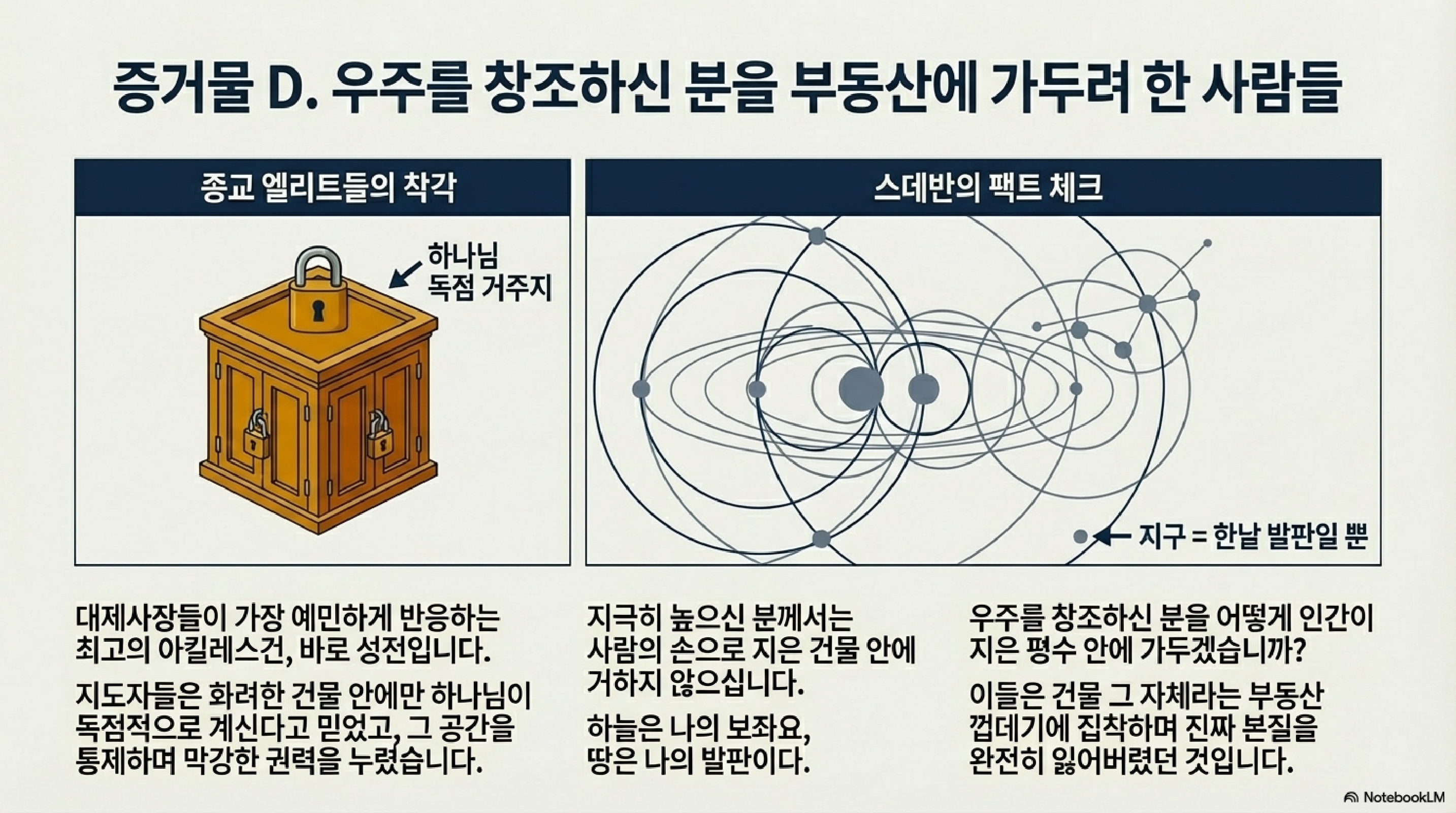 - 하나님은 성전 매매 계약자가 아닙니다: 하나님은 인간이 만든 건물에 갇히지 않으며, 온 우주가 그분의 보좌입니다.