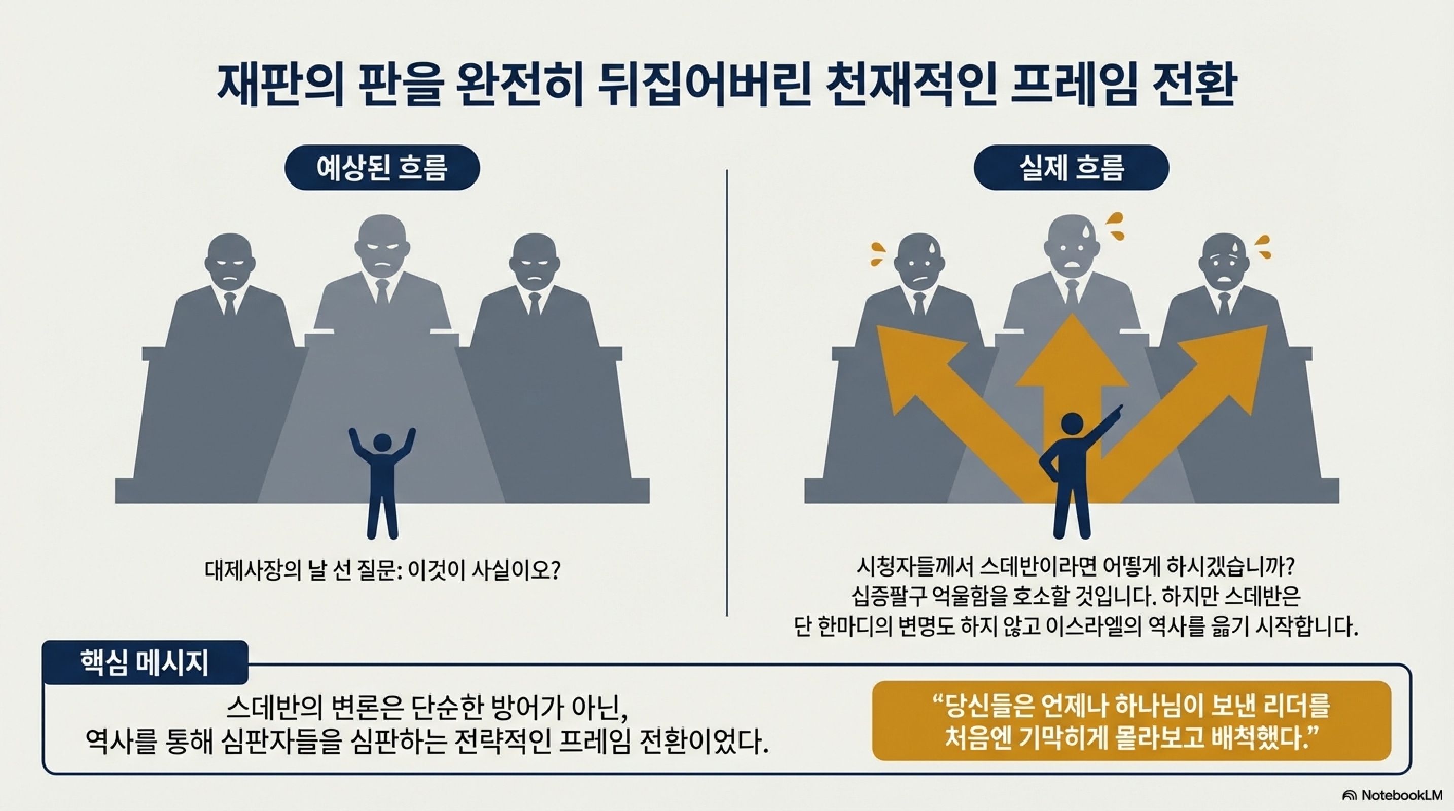 지금 이 현장은 흡사 현대의 국회 청문회나 대검찰청 조사실 같은 살벌한 분위기입니다. 대제사장이 스데반에게 이게 사실이냐며 서슬 퍼런 질문을 던지는 순간, 스데반은 변호사를 부르는 대신 이스라엘 전체 역사를 관통하는 거대한 브리핑을 시작합니다. 아브라함 이야기부터 꺼내며 차곡차곡 빌드업을 시작하는 그의 전략, 그 치밀한 논리의 전개를 지금부터 살펴보겠습니다.