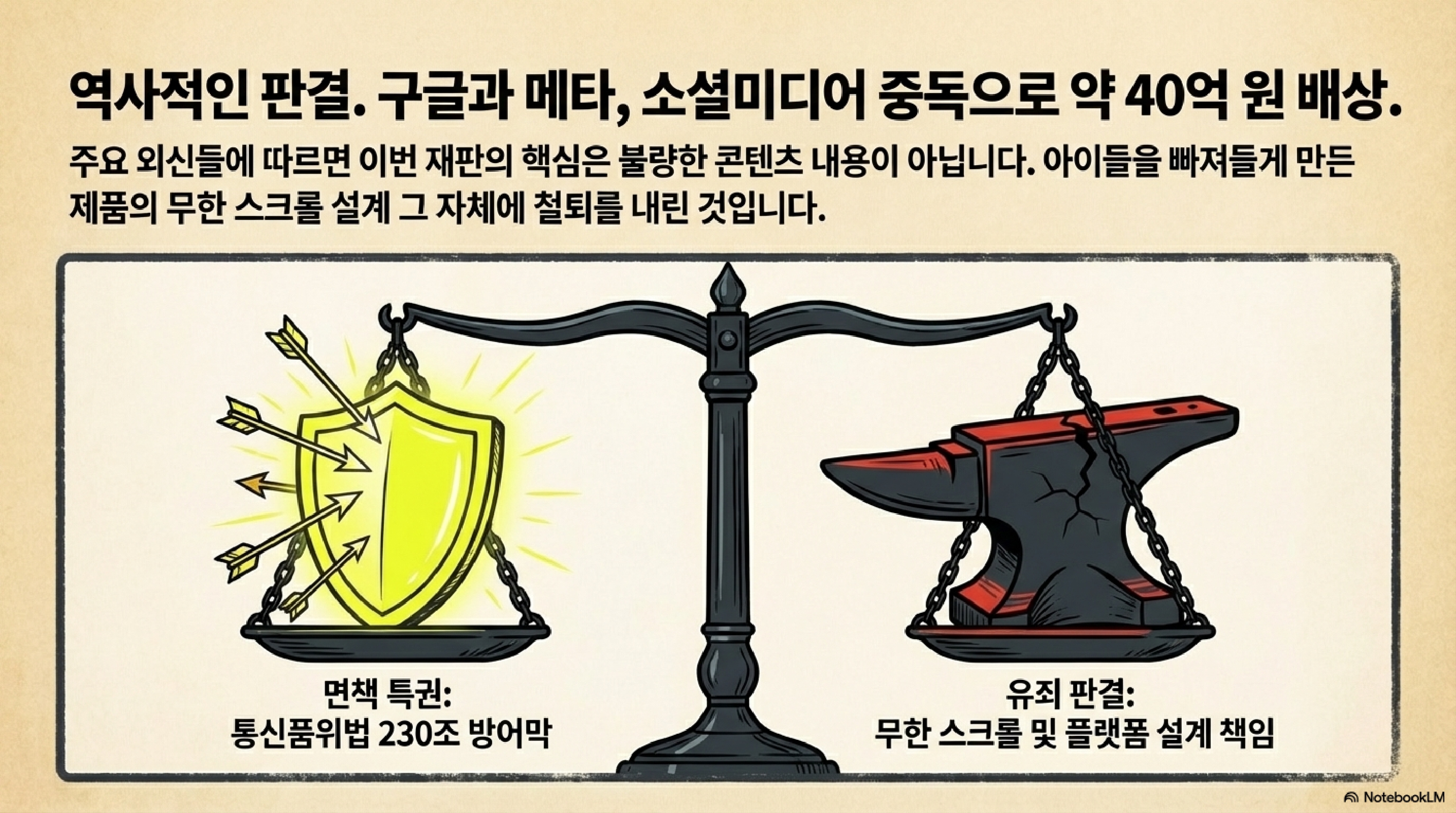 이 사건의 디테일을 보면 경악스럽습니다. 케일리는 불과 6살에 유튜브를 시작했고, 9살에 인스타그램에 가입했습니다. 10살이 되기도 전에 200개가 넘는 영상을 올렸고, 15살 무렵엔 무려 15개의 인스타그램 계정을 운영하며 하루 16시간을 앱에 쏟아부었습니다. 이 20세 여성의 승리가 무서운 이유는 빅테크가 수십 년간 무적의 방패로 휘둘러온 통신품위법 제230조를 무력화했기 때문입니다. 플랫폼은 유해 콘텐츠에는 책임이 없을지 몰라도, 중독을 유도하는 결함 있는 디자인 자체에 대해서는 책임을 져야 한다는 논리입니다. 이는 네이버나 카카오 같은 국내 플랫폼 기업들의 면책 특권에도 종언을 고하는 법적 청사진이 될 수 있습니다.