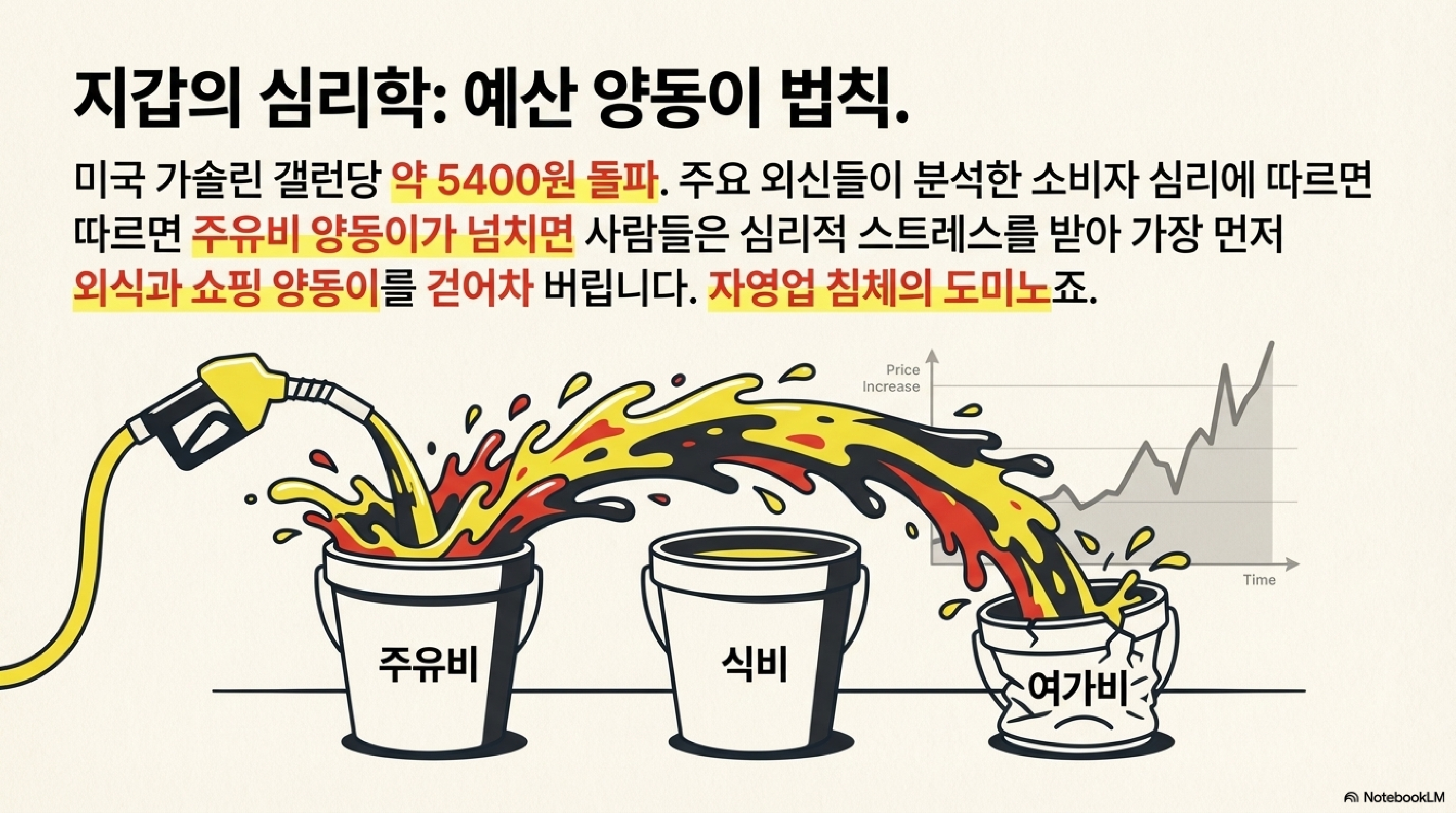 여기서 하버드의 제이슨 퍼먼 교수가 지적한 가격의 가시성(Salience)에 주목해야 합니다. 보험료나 서비스 이용료가 조용히 오를 때는 둔감하던 소비자들이, 거리 곳곳 전광판에 대문짝만하게 걸린 기름값이 오르면 패닉에 빠집니다. 예일대 라비 다르 교수의 이론처럼 사람들은 자신의 예산을 항목별 양동이(Buckets)로 나누어 인식하는데, 기름값이라는 양동이가 넘치는 순간 사람들은 극심한 스트레스를 느끼며 외식과 쇼핑을 단칼에 끊어버립니다.