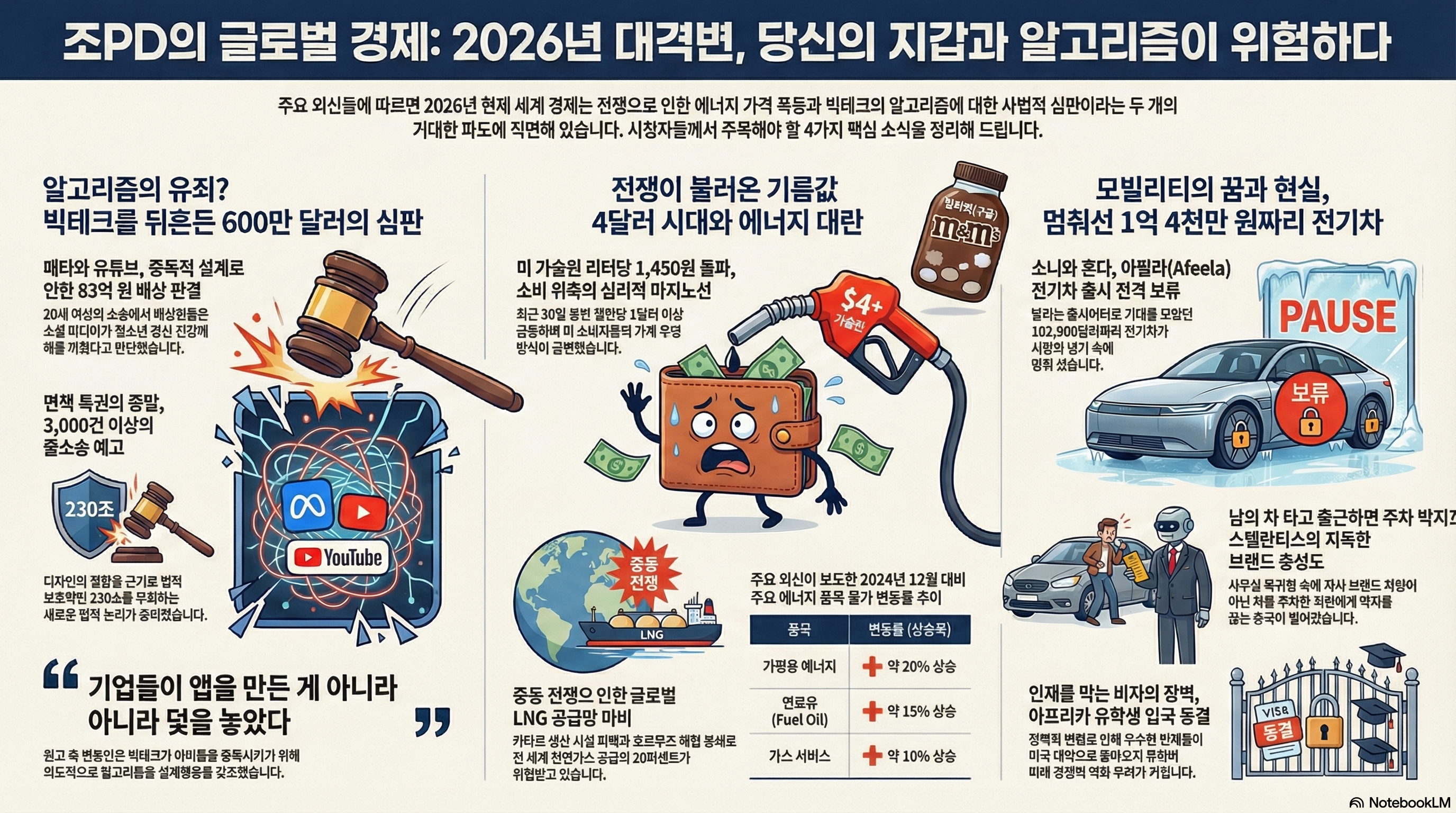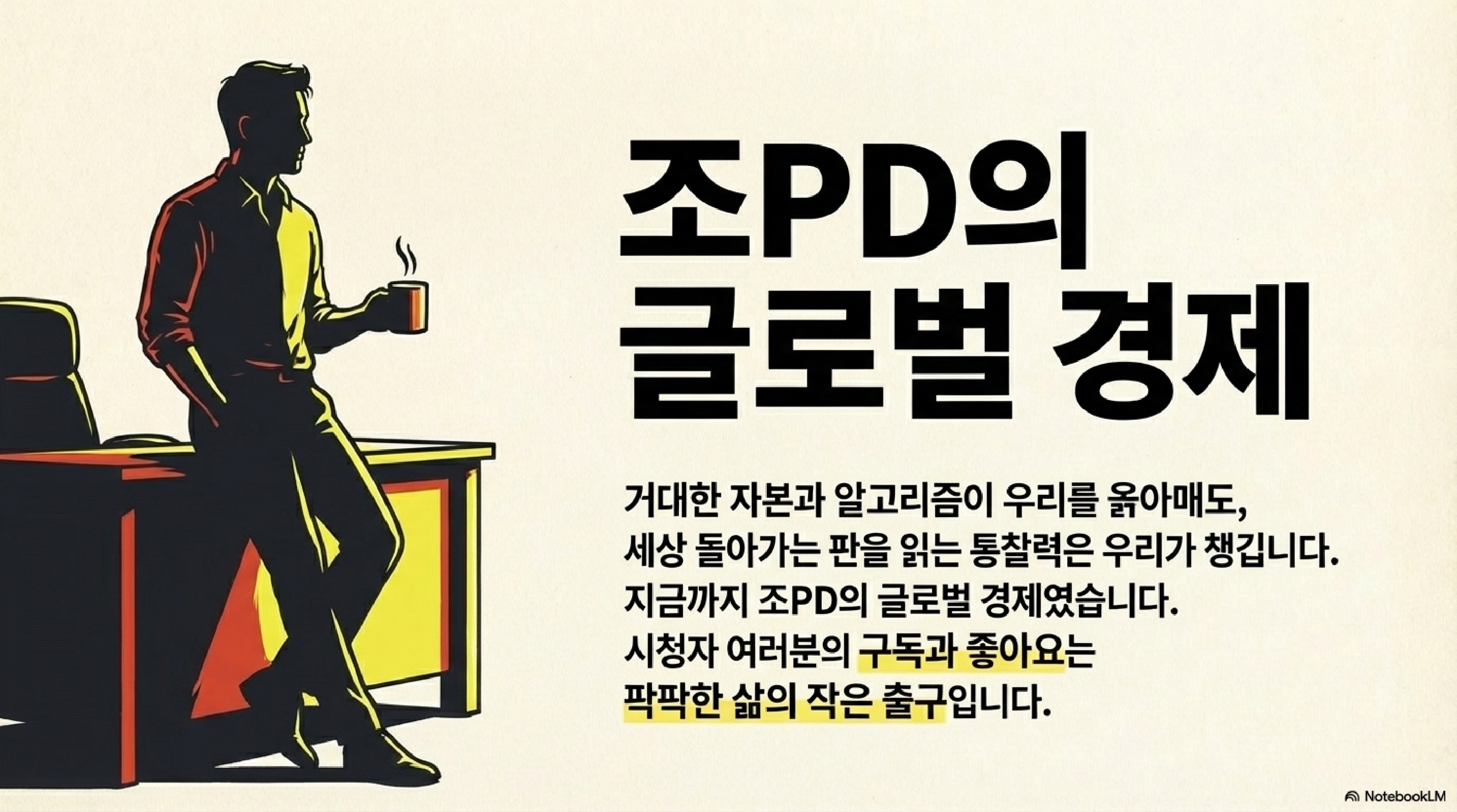 글로벌 경제의 파도는 단순히 먼 나라 이야기가 아닙니다. 미국의 인플레이션이 한국의 대출 금리를 결정하고, 미국의 플랫폼 판결이 네이버와 카카오의 미래를 결정합니다. 시청자들께서 오늘 제가 드린 통찰을 바탕으로, 보이지 않는 설계자의 의도에 휘둘리지 않는 현명한 투자자가 되시길 바랍니다. 조PD의 글로벌 경제, 오늘 순서는 여기까지입니다. 시청해 주셔서 감사합니다.