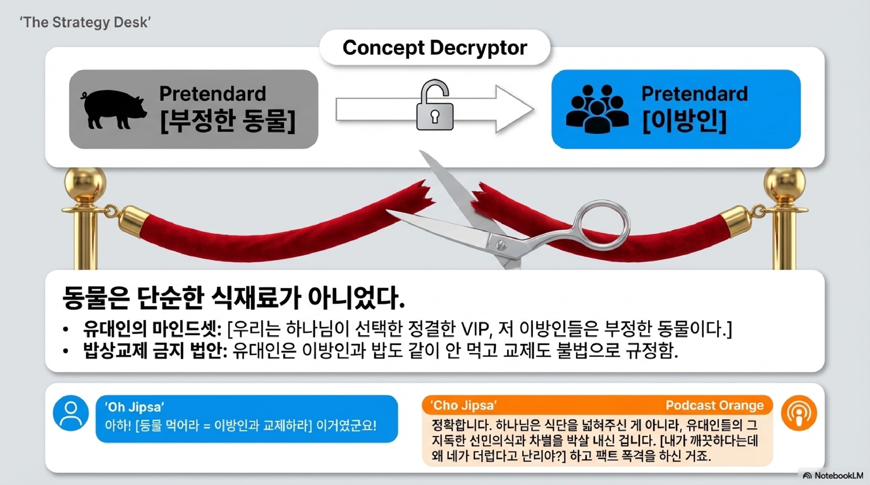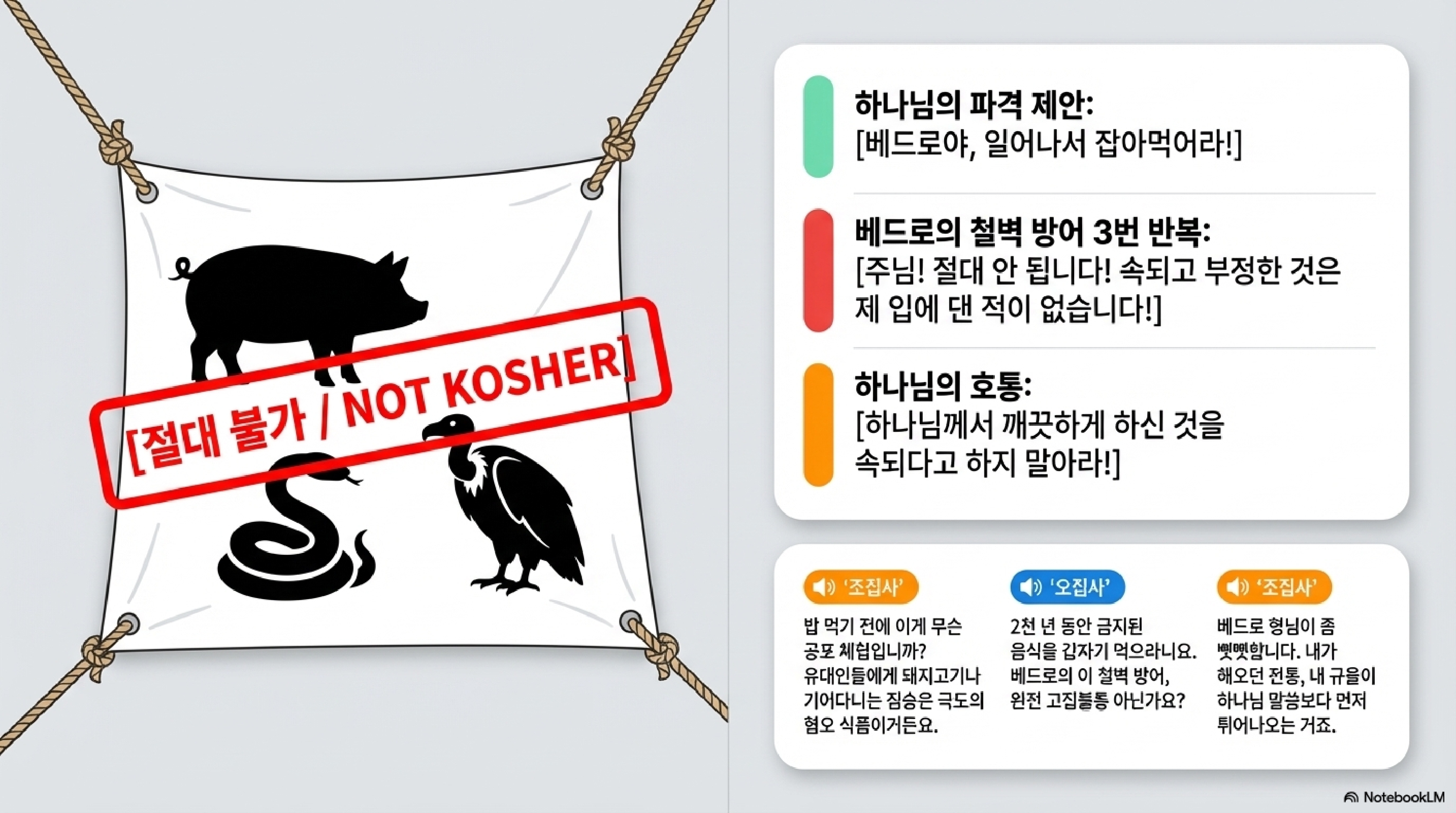 - 조집사: 정확합니다. 이 보자기 환상은 오늘부터 뭐 족발이나 삼겹살을 마음껏 구워 먹어도 좋다는 그런 영양학적 지침이 절대 아닙니다. 이것은 창조주가 직접 유대인들의 세계관을 지탱하던 가장 밑바닥의 주춧돌을 그냥 확 뽑아버리는 거대한 상징입니다.