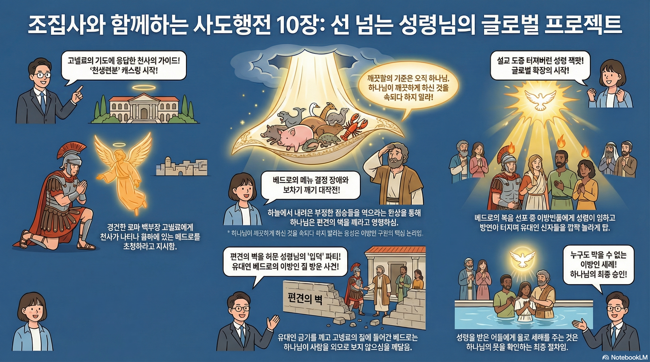 조집사: 맞습니다. 고넬료라는 멋진 로마 '인싸'가 베드로라는 '정통파'를 만나 하나님의 그림을 완성하는 과정이 참 드라마틱하죠? 시청자들께서도 오늘 하루, 내가 그어놓은 마음의 선을 넘어서는 용기를 한 번 내보시면 어떨까요?