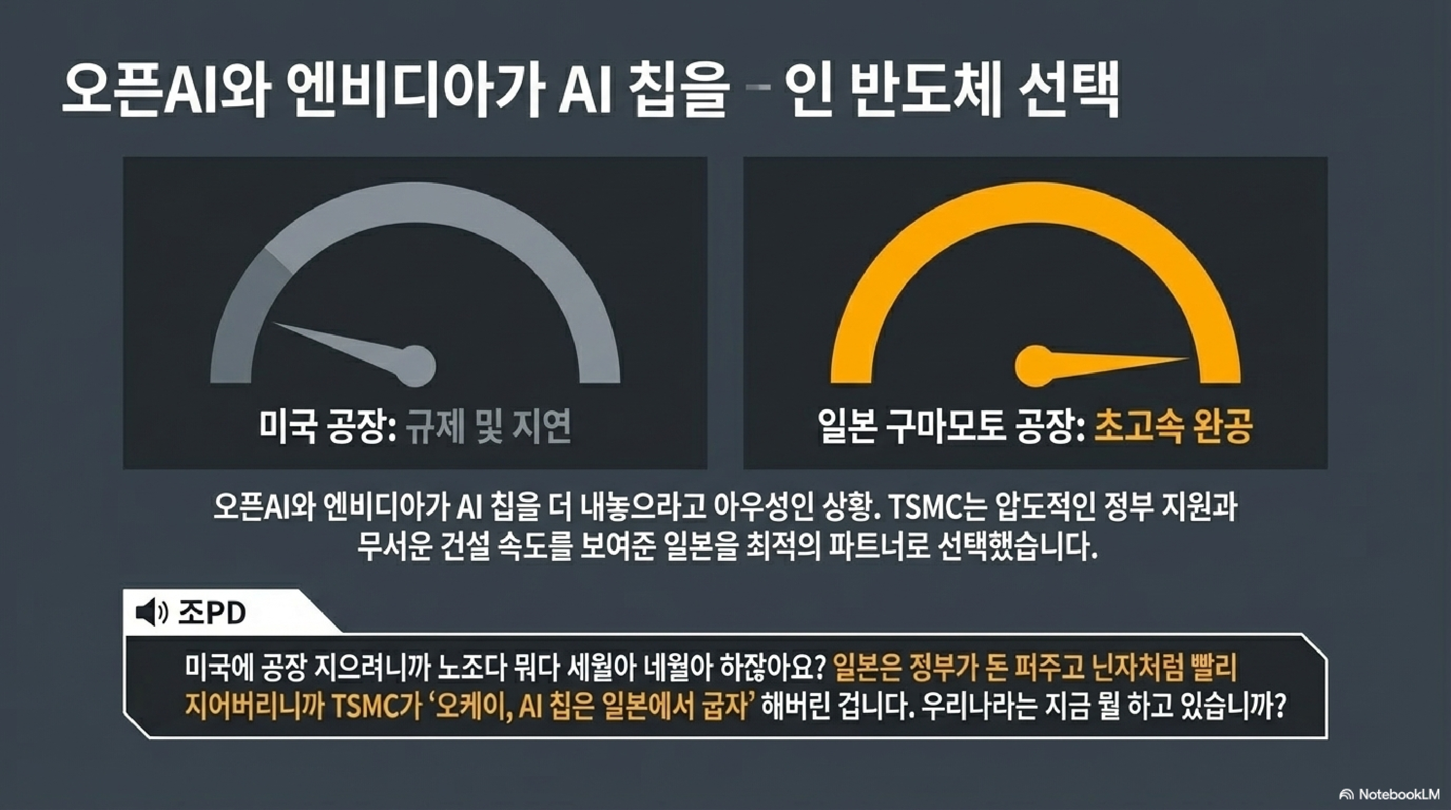 - 조PD: 네, 오늘 우리 참 많은 이야기를 나눴습니다. 중동의 막힌 바닷길에서 시작해서, 돈을 쏟아부어도 속도를 낼 수 없는 미국의 반도체 공장, 그리고 그 속도를 삼켜버린 일본의 지자체 실행력을 거쳐서요.