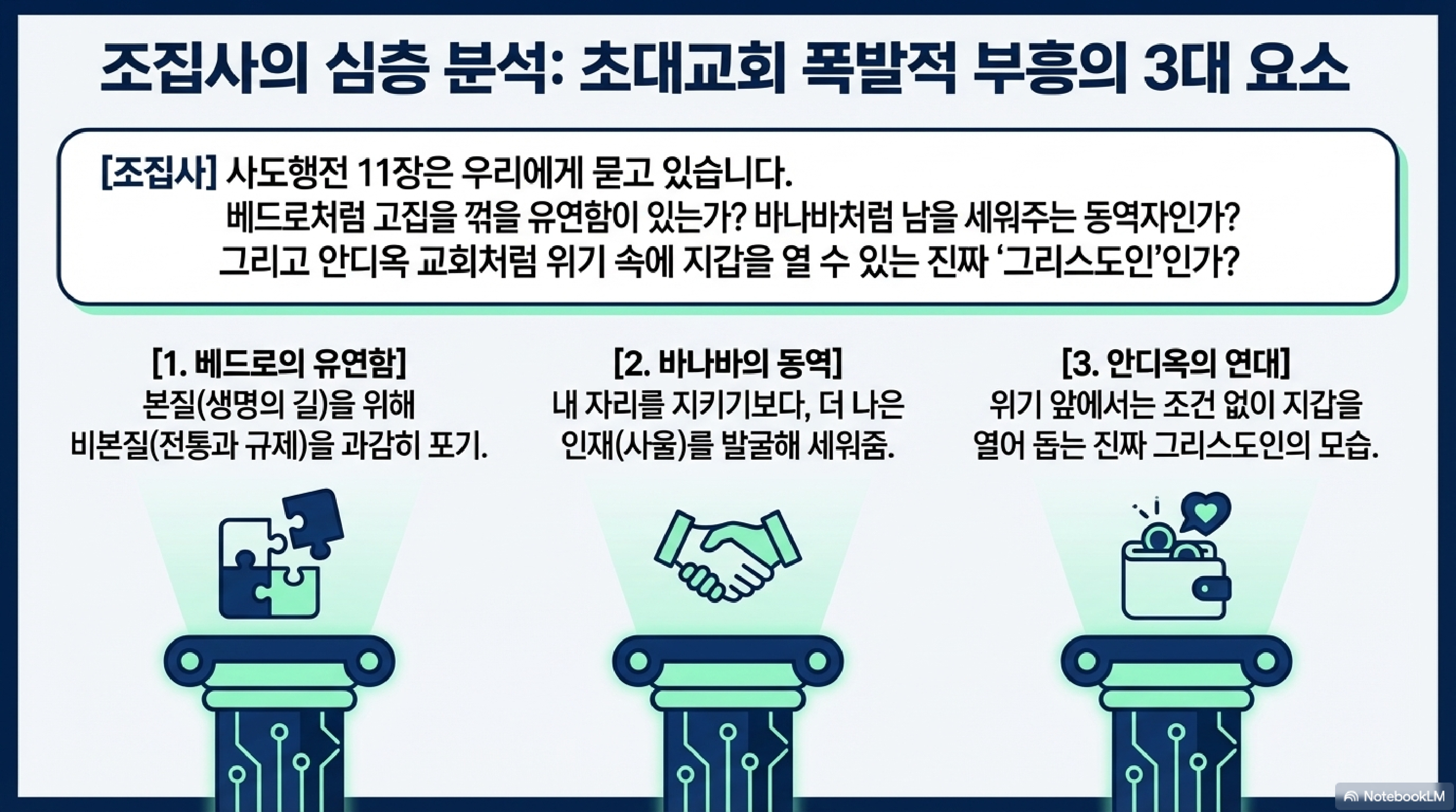 [Cho Jipsa] 논리 앞에 장사 없습니다. 하나님이 이방인에게도 생명 얻는 회개를 주셨다는 걸 공식적으로 승인한 겁니다. 개인의 체험이 공식적인 조직의 선교 정책으로 확정되는 결정적인 '전략적 변곡점'이 된 거죠.