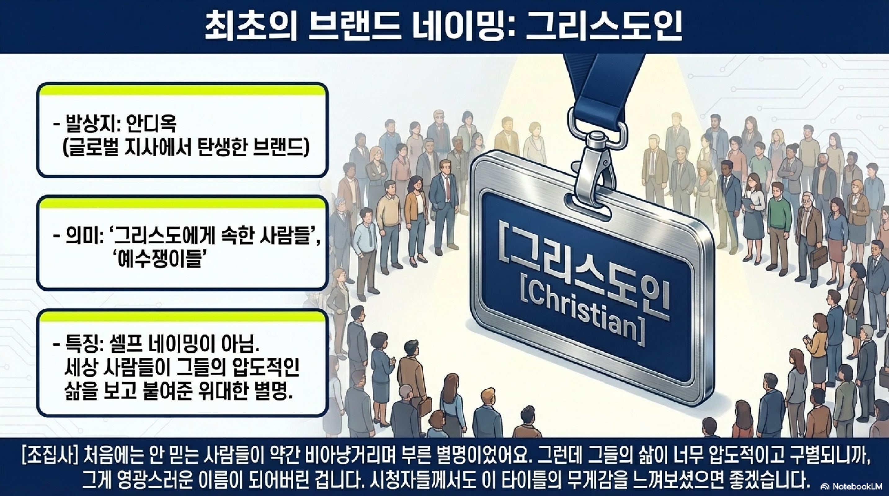 [Cho Jipsa] 네, 기독교 역사상 가장 강력한 '오가닉 마케팅'의 성공 사례죠. 사실 당시 '그리스도인(Christian)'이라는 명칭은 세상 사람들이 보기에 "저 사람들은 예수라는 인물에 미친 사람들이다"라며 비아냥거리는 일종의 멸칭이었습니다. 인터넷으로 치면 '안티'들이 붙여준 이름인데, 이 부정적인 PR이 오히려 독보적인 정체성을 드러내는 프리미엄 브랜드가 된 겁니다.