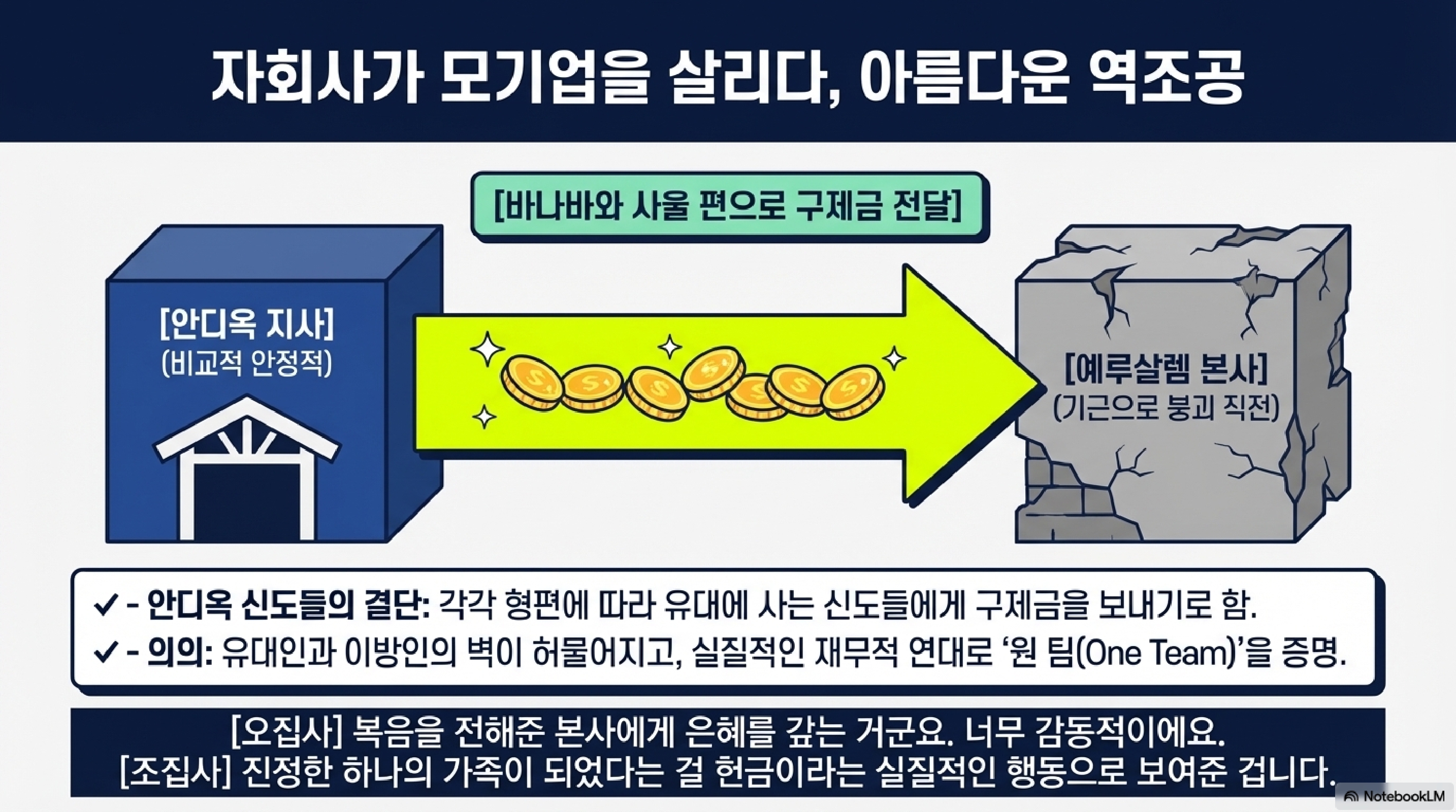 - 👨💼 조집사: "이렇게 영적으로 훌륭하게 성장하고 세상의 인정까지 받은 안디옥 교회가 이제 그 성숙함을 단순히 말이나 교리가 아니라 진짜 눈에 보이는 돈과 행동으로 증명할 타이밍이 왔습니다."