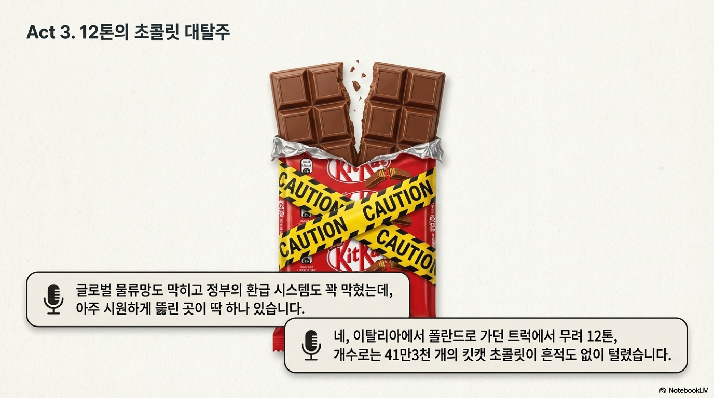 하지만 주의할 점이 있습니다. 이런 밈 마케팅은 초콜릿이니까 통하는 겁니다. 비행기 추락이나 기름 유출 같은 진지한 사고에 썼다간 바로 매장입니다. 네슬레는 이 도둑질이 공급망에 큰 타격이 없다는 걸 계산하고 유머라는 세탁기를 돌린 겁니다. 결국 세상은 킷캣을 훔친 도둑보다, 그 도둑질을 이용해 주가를 올리는 놈들이 이기는 곳입니다.