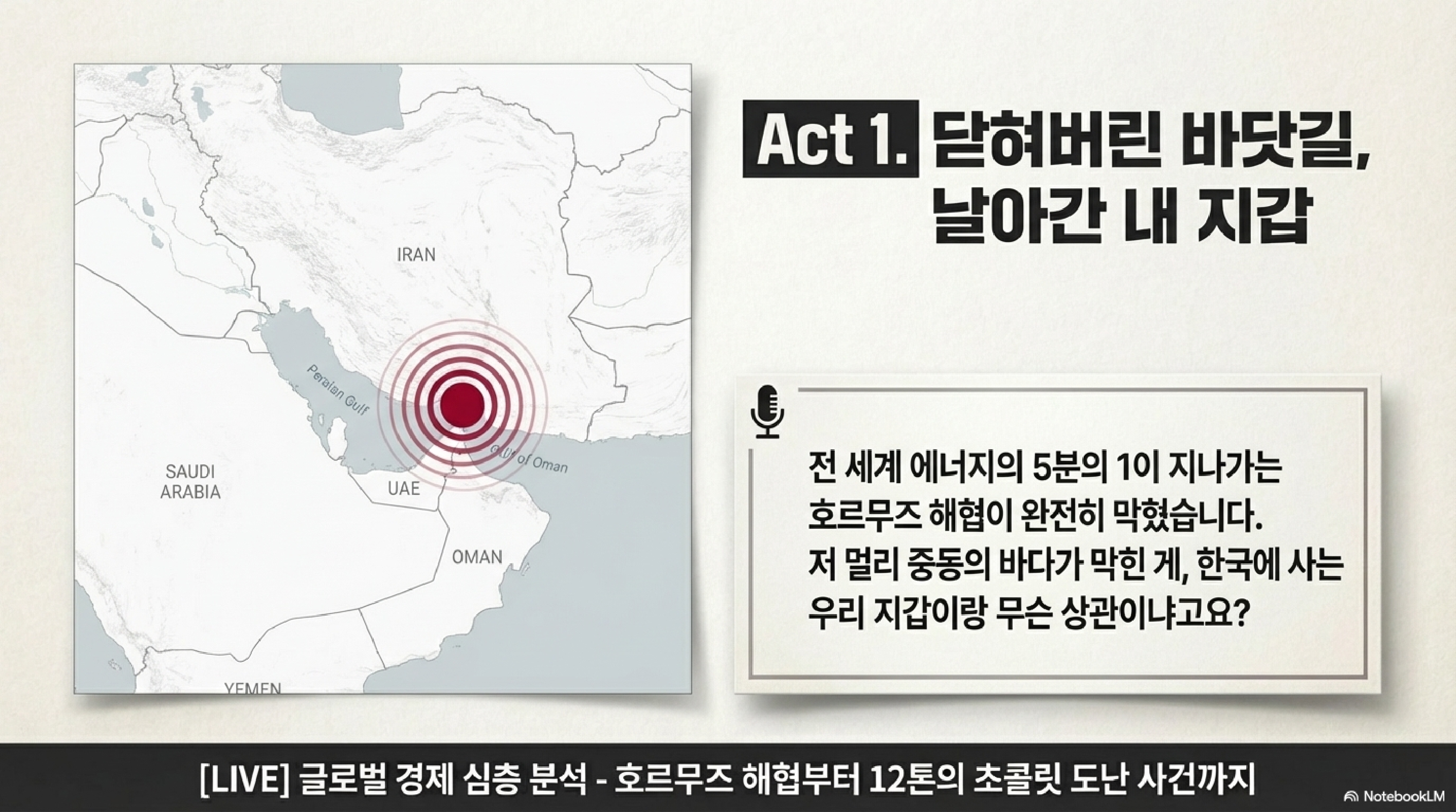 조PD: 와, 중동이 이제 단순한 주유소가 아니라 글로벌 공급망의 아주 중요한 제조업이랑 물류 허브로 편입된 상태잖아요. 근데 여기서 이런 총체적 마비가 오니까 전 세계 경제가 진짜 도미노처럼 무너지는 거군요.