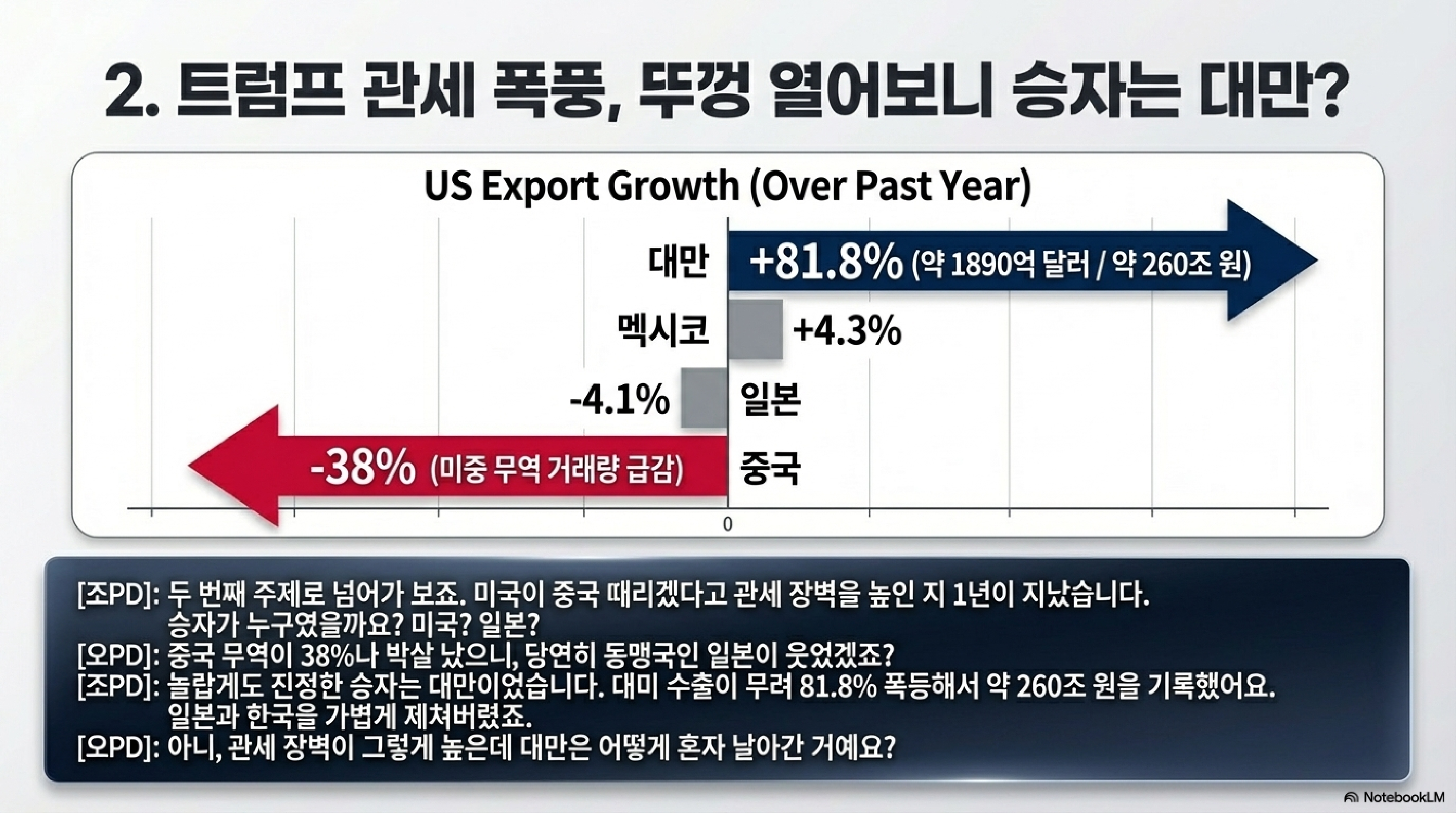 | 조PD | 근데 진짜 놀랍고도 얄미운 포인트는 따로 있단 말이죠. 이 살벌한 무역 장벽 속에서 대만의 대미 수출액이 무려 81%나 폭증했다는 사실입니다. 금액으로만 약 250조 원을 쓸어 담으면서 굳건했던 한국하고 일본을 제치고 단숨에 아시아 1위로 올라섰어요. |