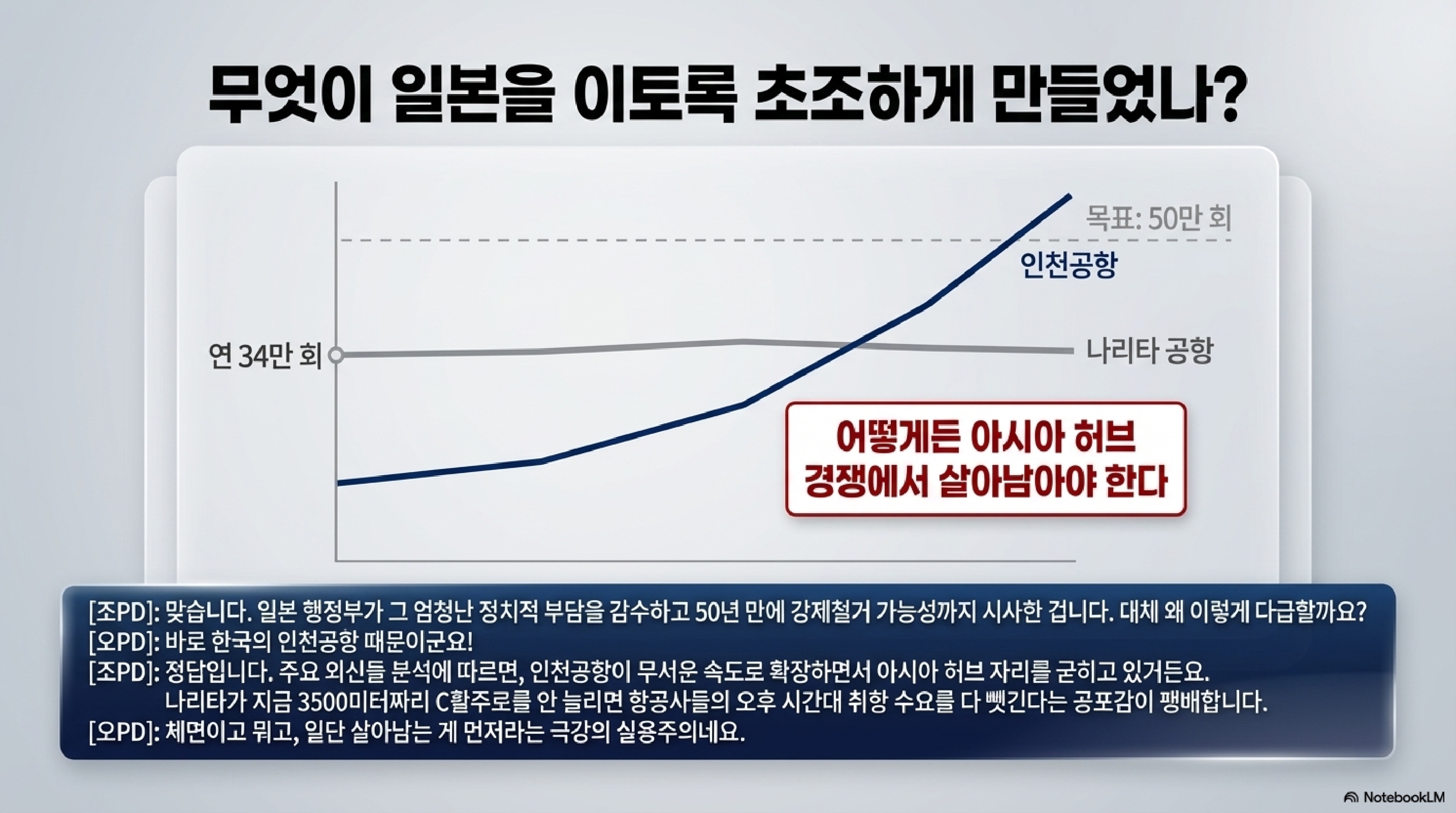 | 오PD | 아니 아직 어떤 글로벌 항공사도 그 공항에 취항하겠다고 계약서에 사인한 적이 없는데, 일단 활주로 깔고 관제탑부터 올리고 보는 거잖아요. 이 라피더스의 90조 원짜리 도박, 이거 과연 승산 있는 게임입니까? 아니면 모래 위에 짓는 성입니까? |