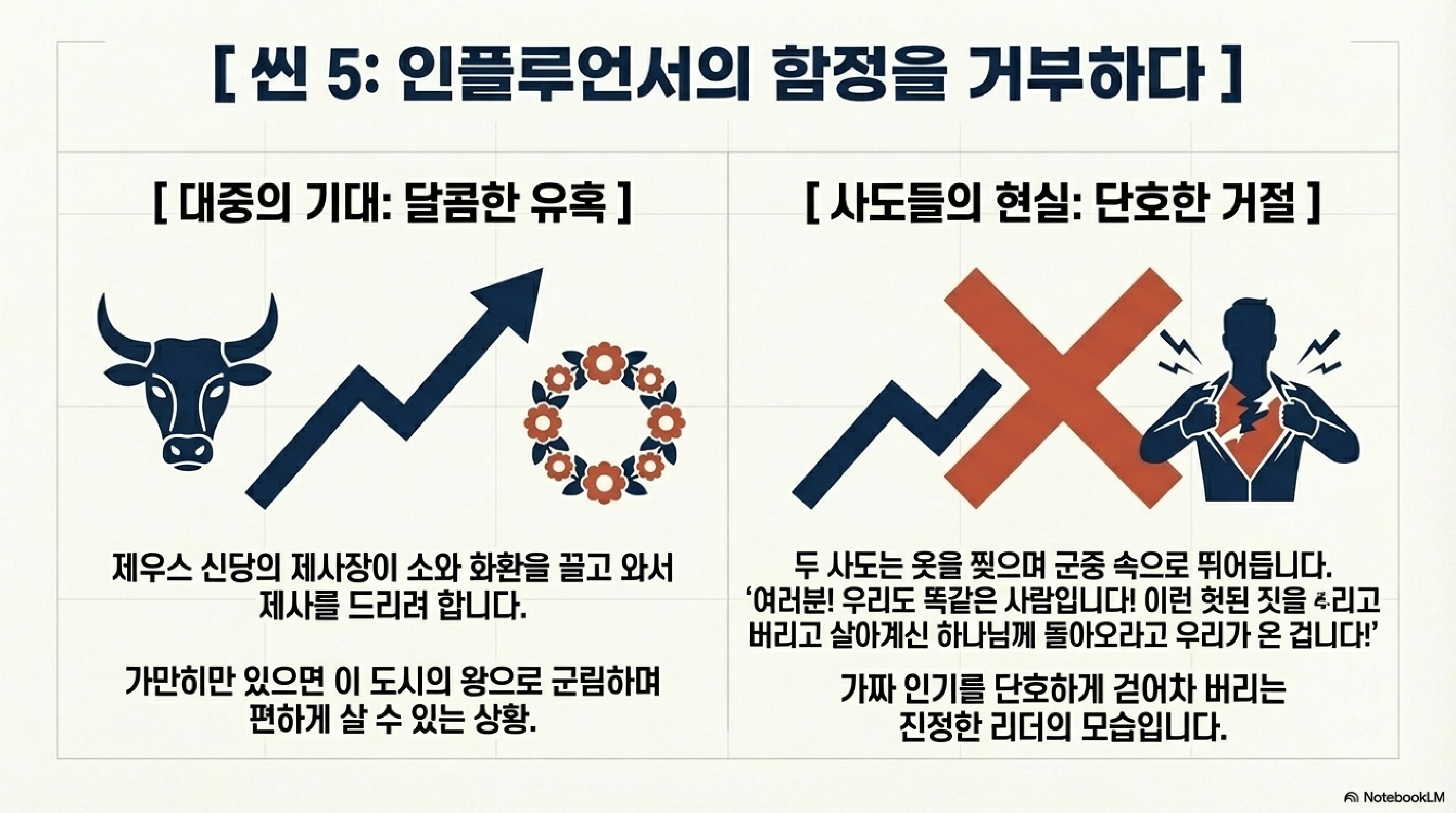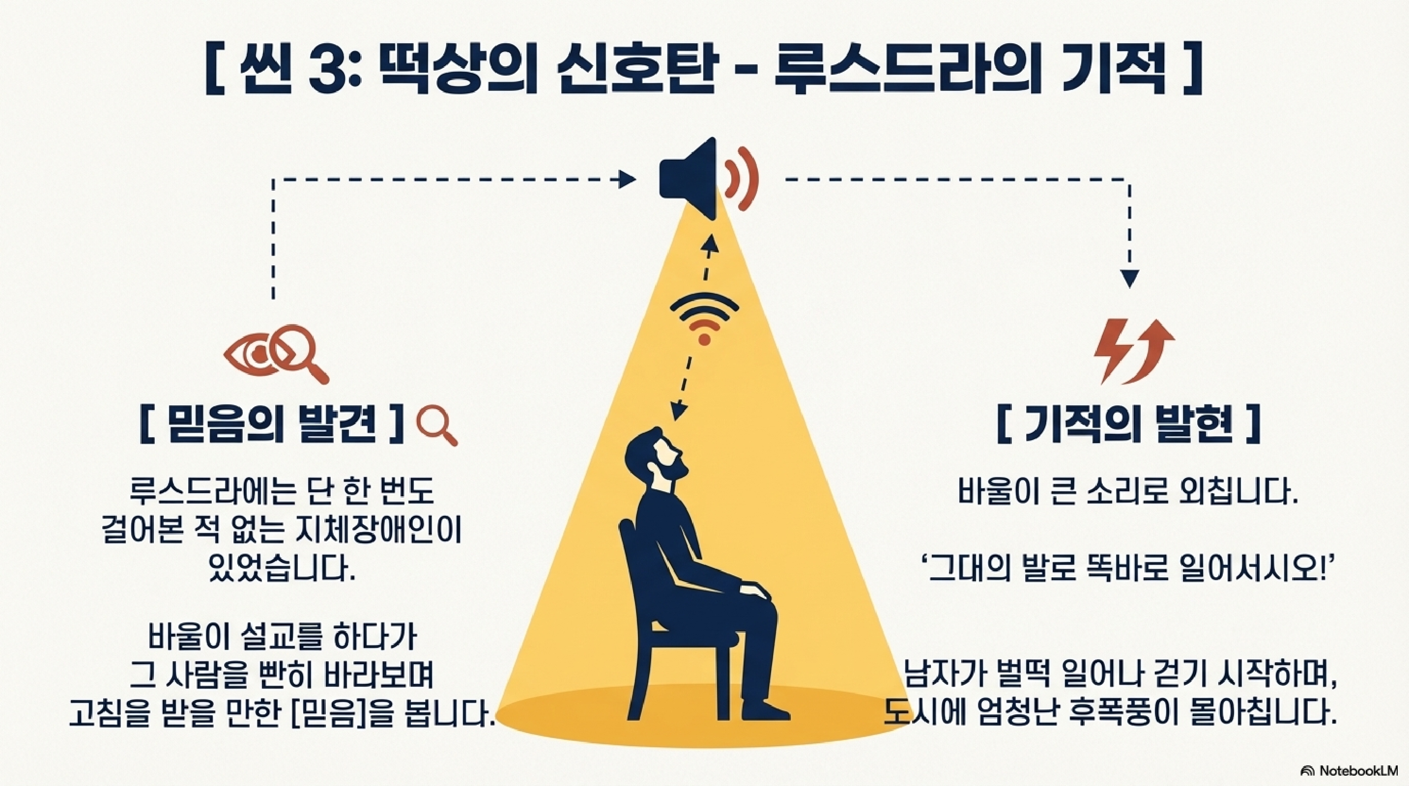 여기서 우리가 주목해야 할 So What은 이것입니다. 복음이 들어간 곳에 분열이 일어났다는 건, 역설적으로 그 메시지가 엄청난 파급력을 발휘하고 있다는 증거입니다. 아무런 가치가 없는 메시지는 갈등조차 일으키지 못합니다. 도시 전체가 흔들릴 정도의 에너지가 발생했다는 것, 그것이 바로 복음의 영향력입니다. 메시지가 아무도 불편하게 만들지 않는다면, 그것은 아무것도 바꾸지 못하는 죽은 메시지일 뿐입니다. 관원들까지 합세해 돌로 치려 하자, 사도들은 이 리스크를 피해 잠시 루스드라로 자리를 옮깁니다.