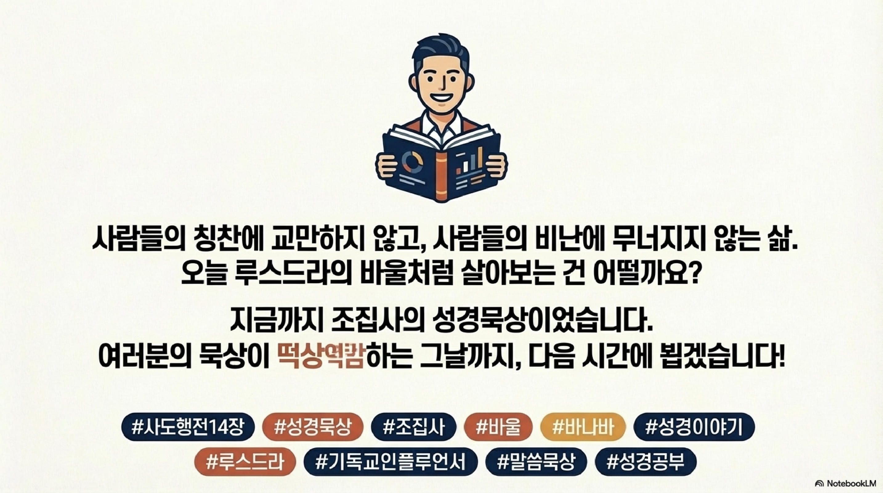 | 🧔 조집사 | 네. 그리고 감정적 요동 속에서도 흔들림 없이 묵묵히 나만의 더베를 지나 다시 돌아가야 할 사명의 자리가 어딘지, 한번 깊이 생각해보는 시간이 되셨기를 바랍니다. 조집사의 성경묵상은 여기까지입니다. |