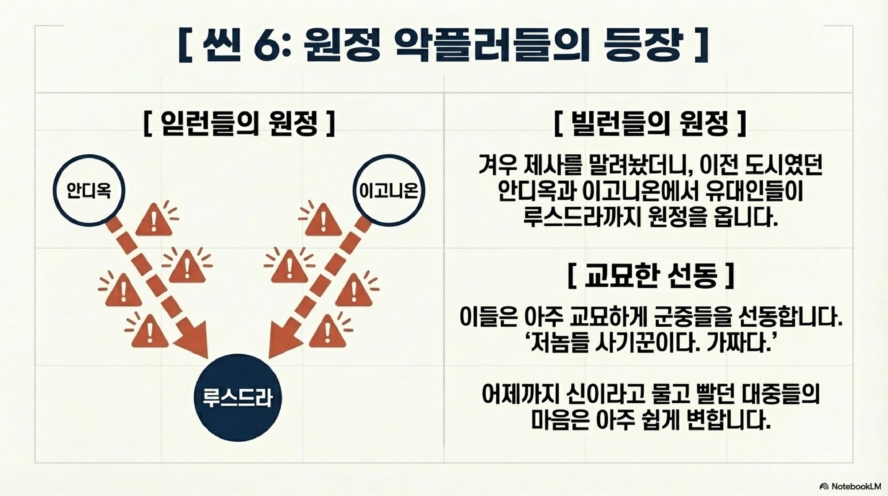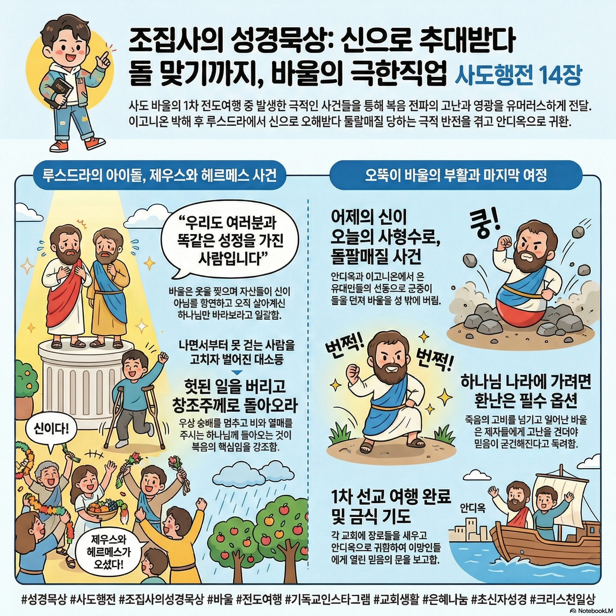 | 👩 오집사 | 맞습니다. 앞서 사도들을 쫓아냈던 안디옥과 이고니온의 유대인들이 무려 이 루스드라까지 원정을 옵니다. |