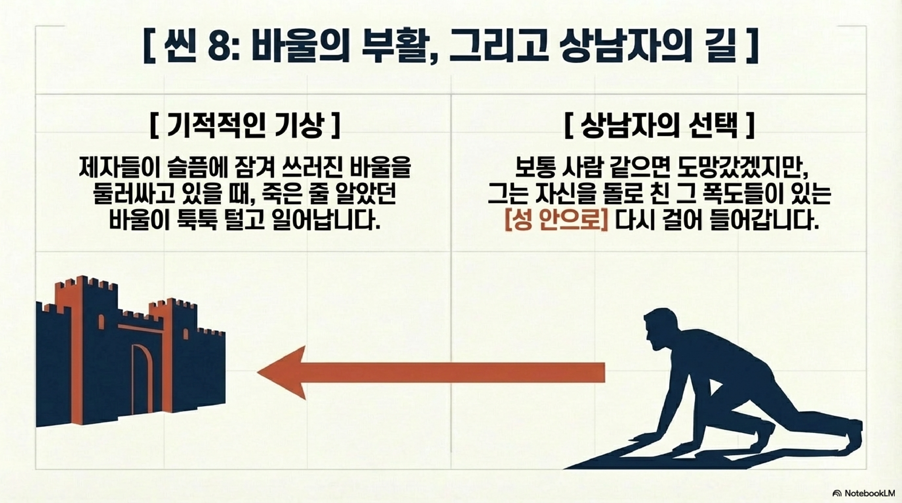 | 🧔 조집사 | 근데 그 피투성이가 된 몸으로 바울이 향한 곳이 어딘 줄 아십니까? 자기를 돌로 쳐 죽이려 했던 그 무서운 사지, 루스드라 성 안으로 다시 걸어 들어갑니다. |