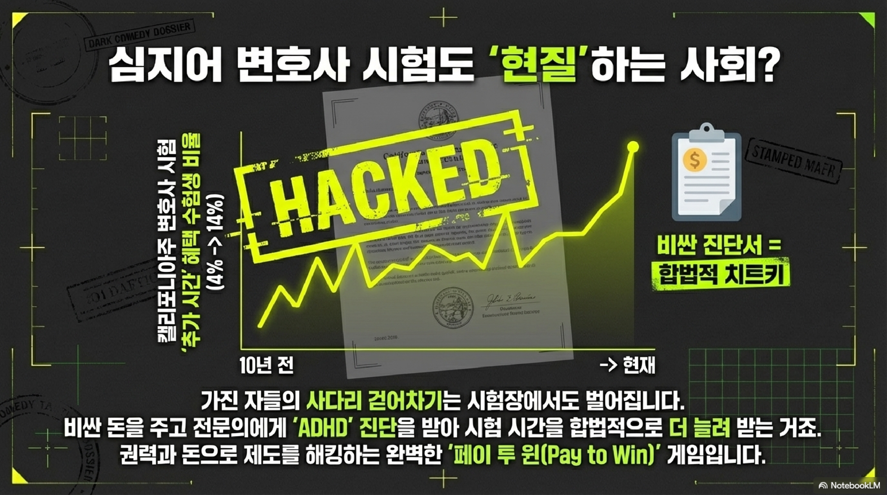 - 시스템 해킹하는 특권층: 캘리포니아 변호사 시험 응시자의 14%가 ADHD 등을 이유로 시험 시간 연장을 받았어. 10년 전보다 3배 넘게 늘었지. 이게 정말 배려일까? 돈 있는 집 애들이 비싼 진단서 끊어서 '시스템 해킹'하는 거 아니냐는 비판이 자자해. 커뮤니티 칼리지 학생들은 3%도 혜택을 못 받는데 말이야.