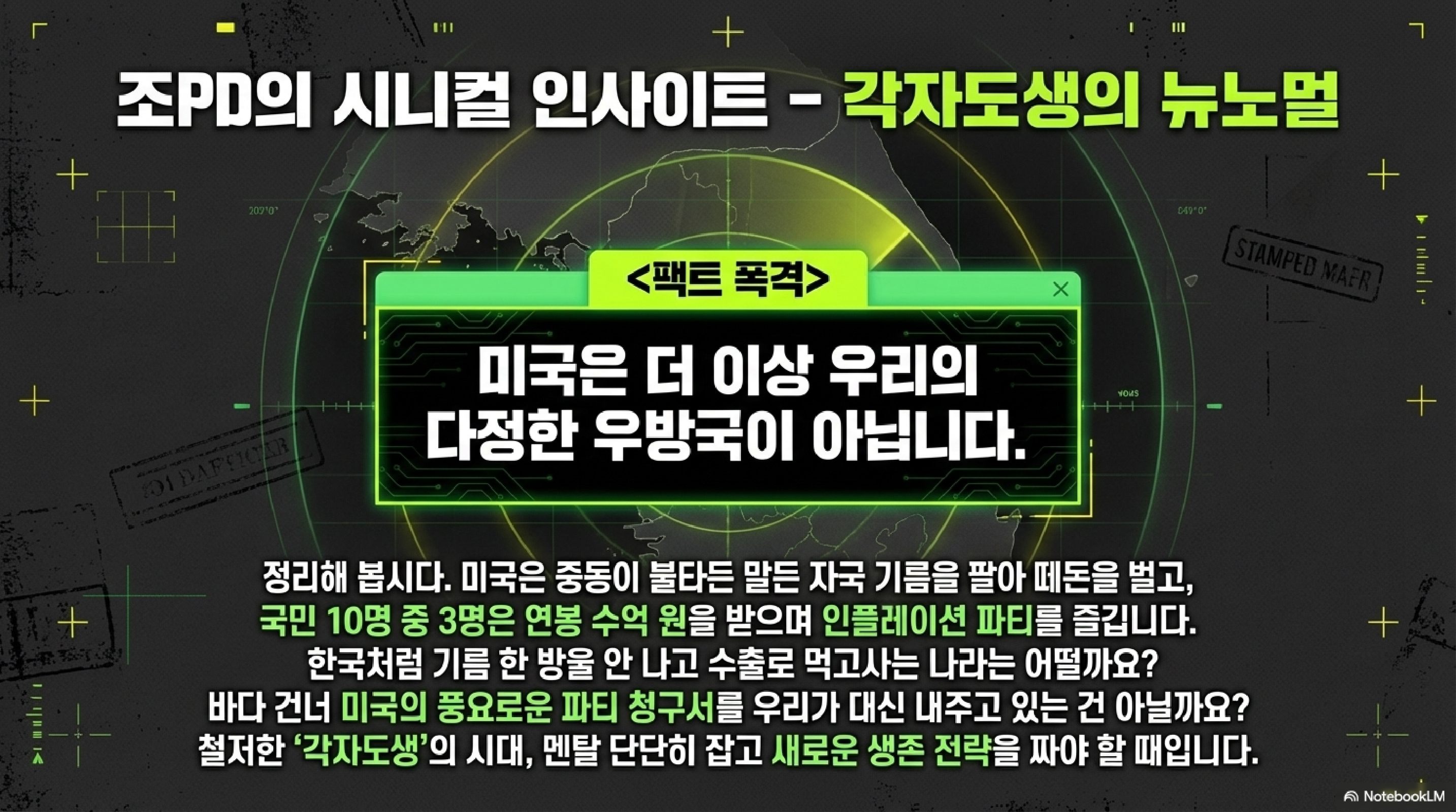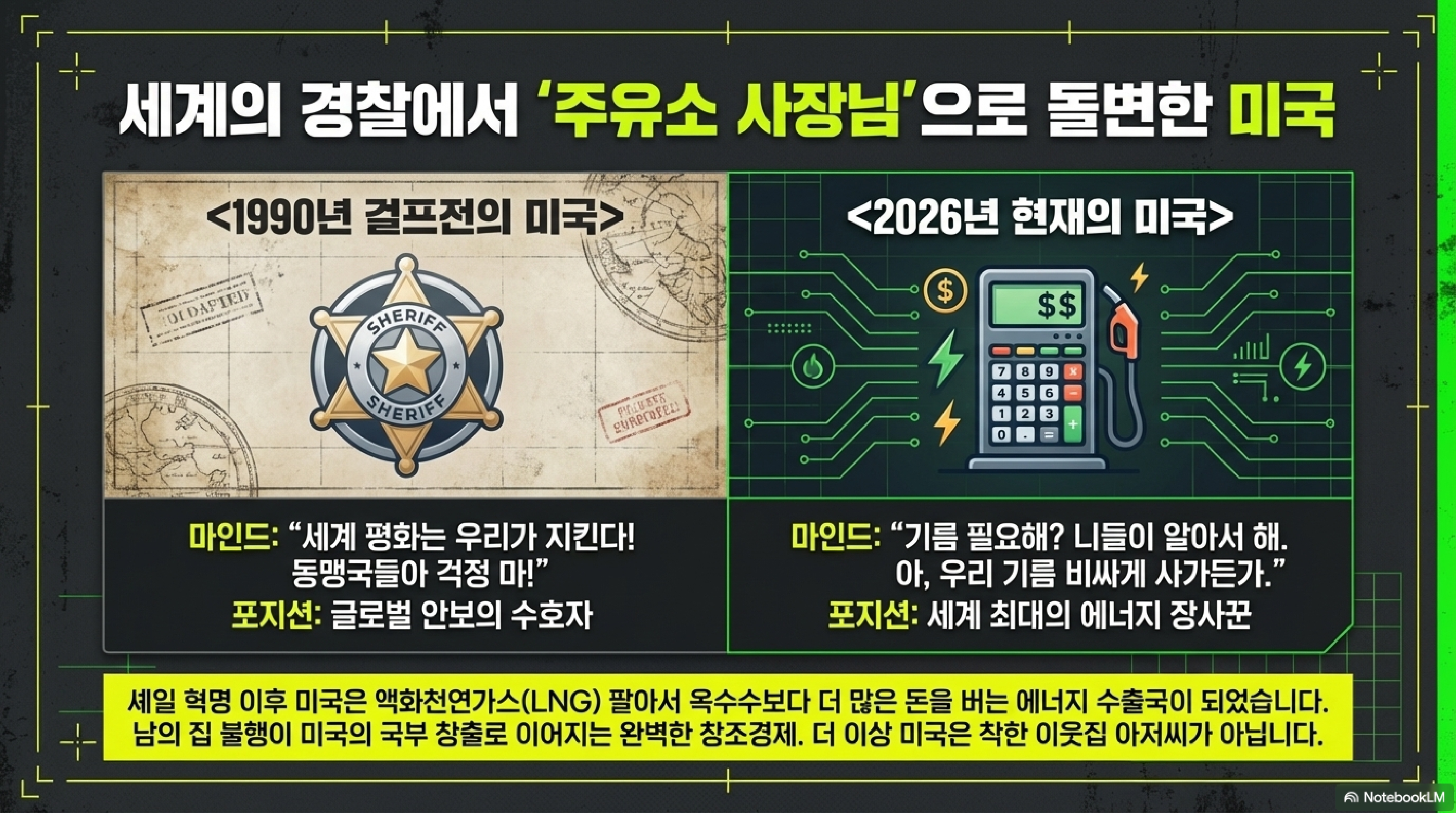 우리 한국인들은 정신 바짝 차려야 해. 미국의 '에너지 Dominance'가 우리 기업과 가계에 어떤 청구서로 돌아올지 계산기 두드려야 한다고. 중동 구출 작전에 쓰인 폭탄 값도 결국 우리 기름값에 녹아 있으니까. 남들이 샴페인 터뜨릴 때 우리는 생존 전략을 짜야 해. 세상에 공짜 풍요는 없으니까 말이야.