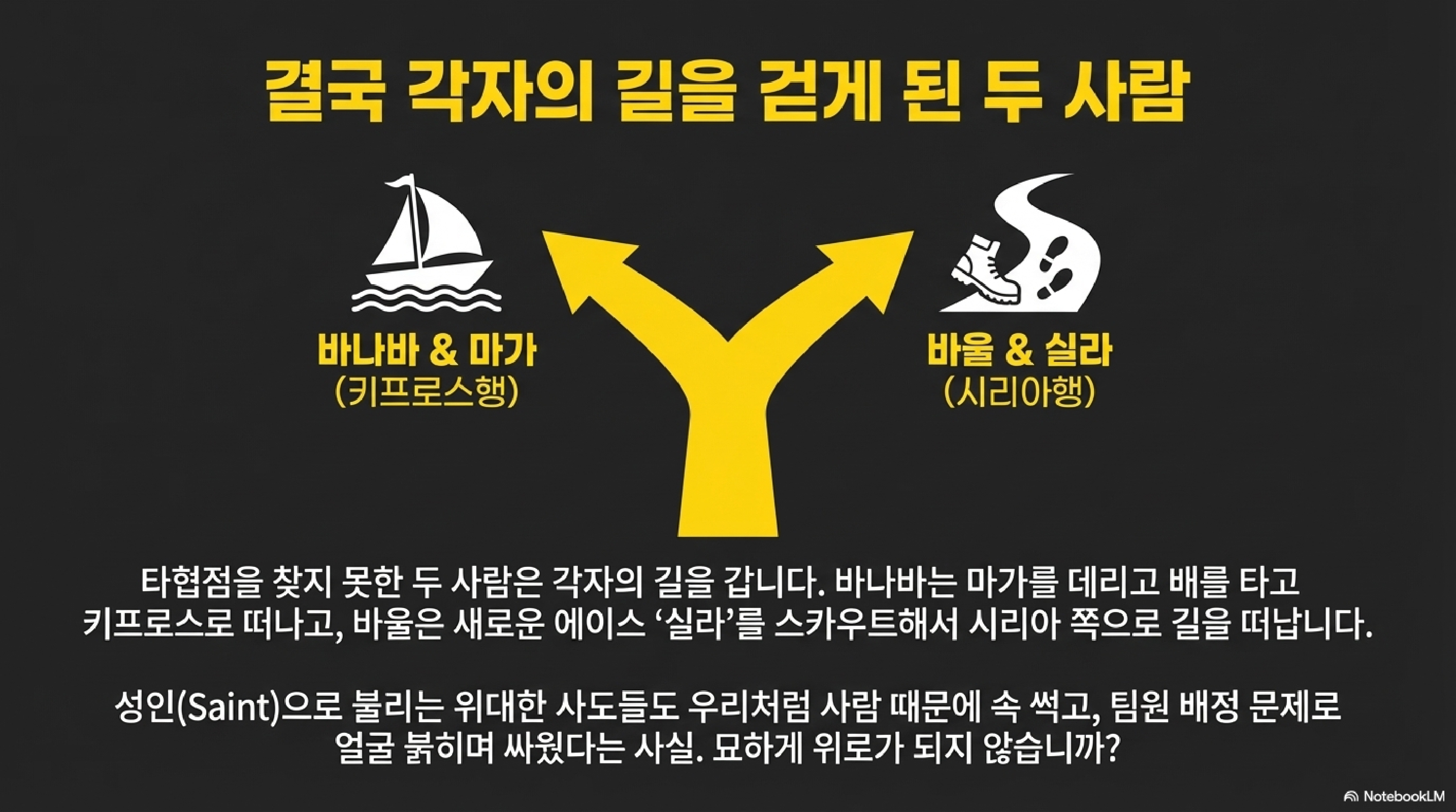 - 결국 두 사도는 서로 결별하여 각각 다른 팀을 꾸리게 되는데, 오히려 이 이별로 인해 복음 전파의 속도와 시너지가 배가됩니다.
