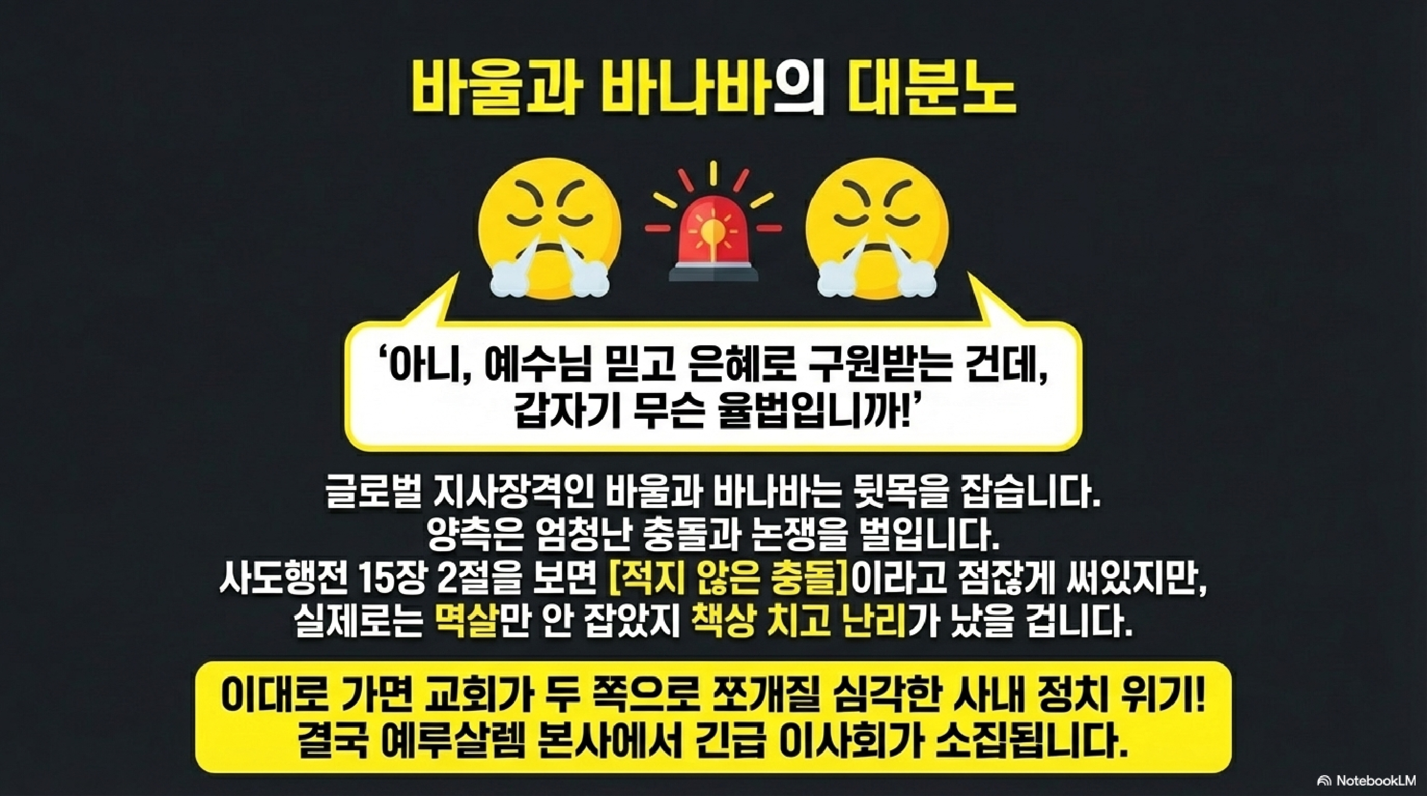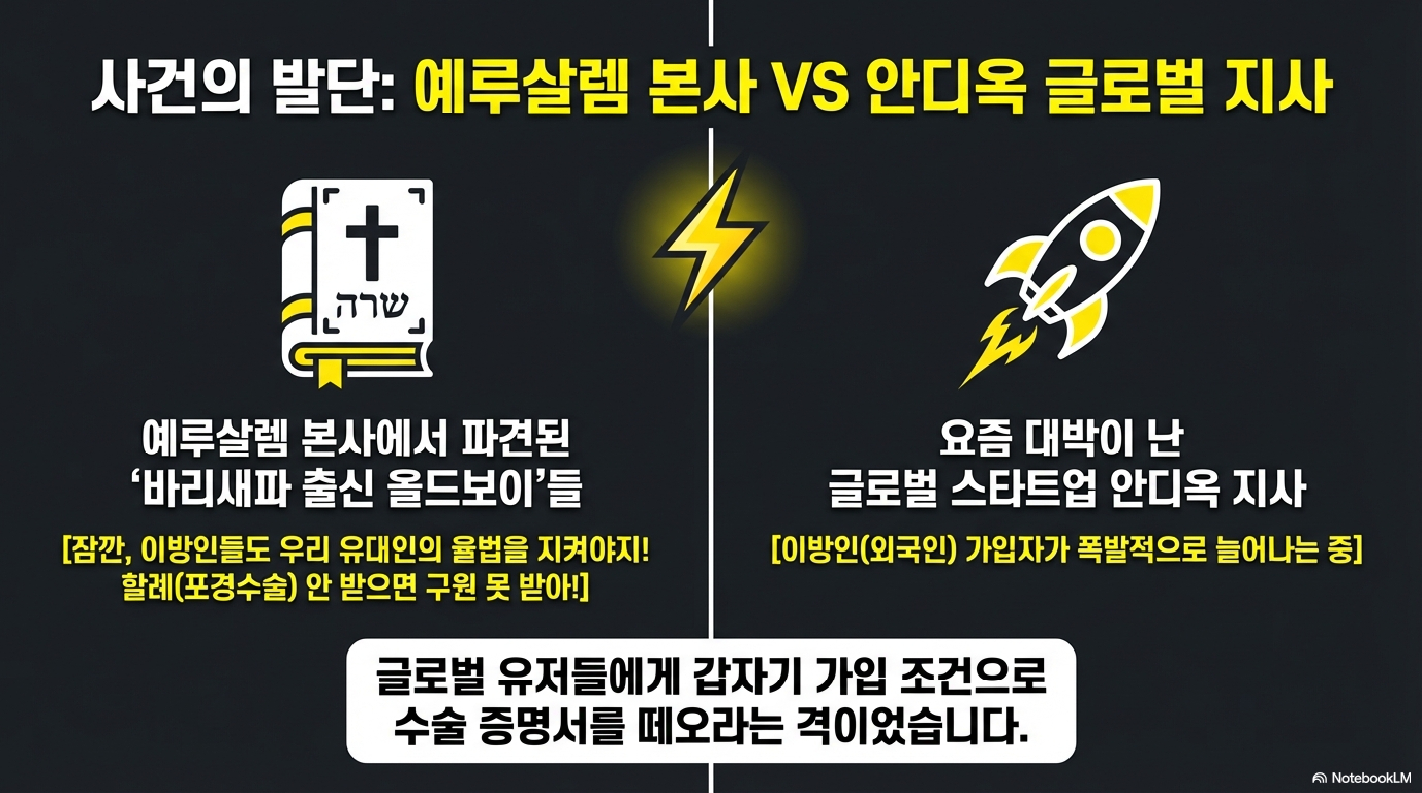 👩💼 오집사 : 그렇죠. 오늘 우리가 깊게 파헤쳐 볼 사도행전 15장의 이야기가 정확히 이 구도에서 출발합니다. 인류 역사상 가장 거대한 무브먼트였던 기독교가 막 폭발적으로 성장하는 과정에서, 내부 파벌 싸움으로 완전히 쪼개질 뻔했던 초대형 위기 사건이죠.