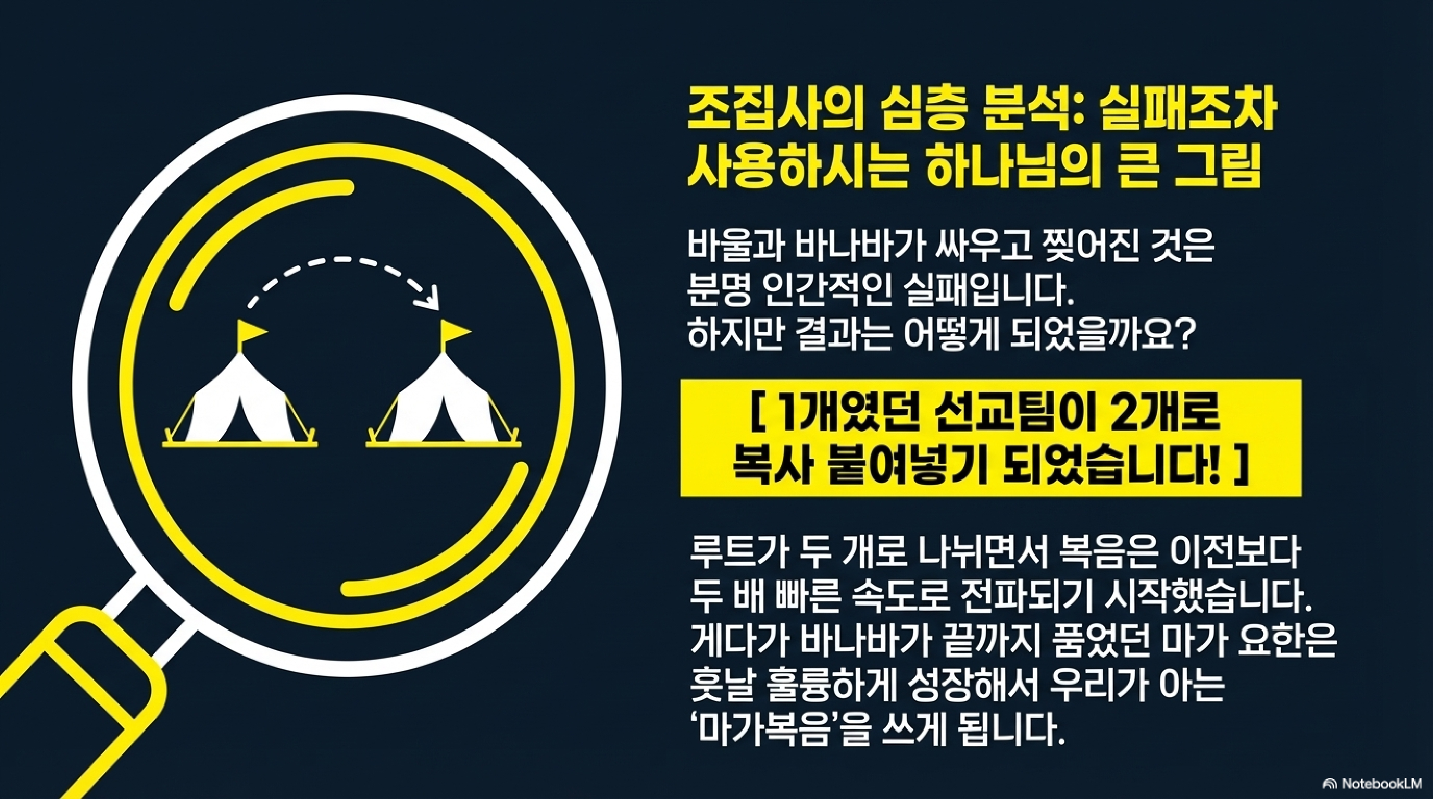 👨💼 조집사 : 정확합니다. 의도치 않게 선교 팀이 증식된 겁니다. 해로와 육로를 통해 각기 다른 지역을 개척하면서, 오히려 복음이 두 배의 속도로 확장되는 위대한 시너지를 낳았죠. 게다가 훗날 바울이 감옥에서 쓴 편지를 보면, 마가를 내게 데려오라. 그가 나의 일에 유익하다며 마가를 다시 찾습니다.