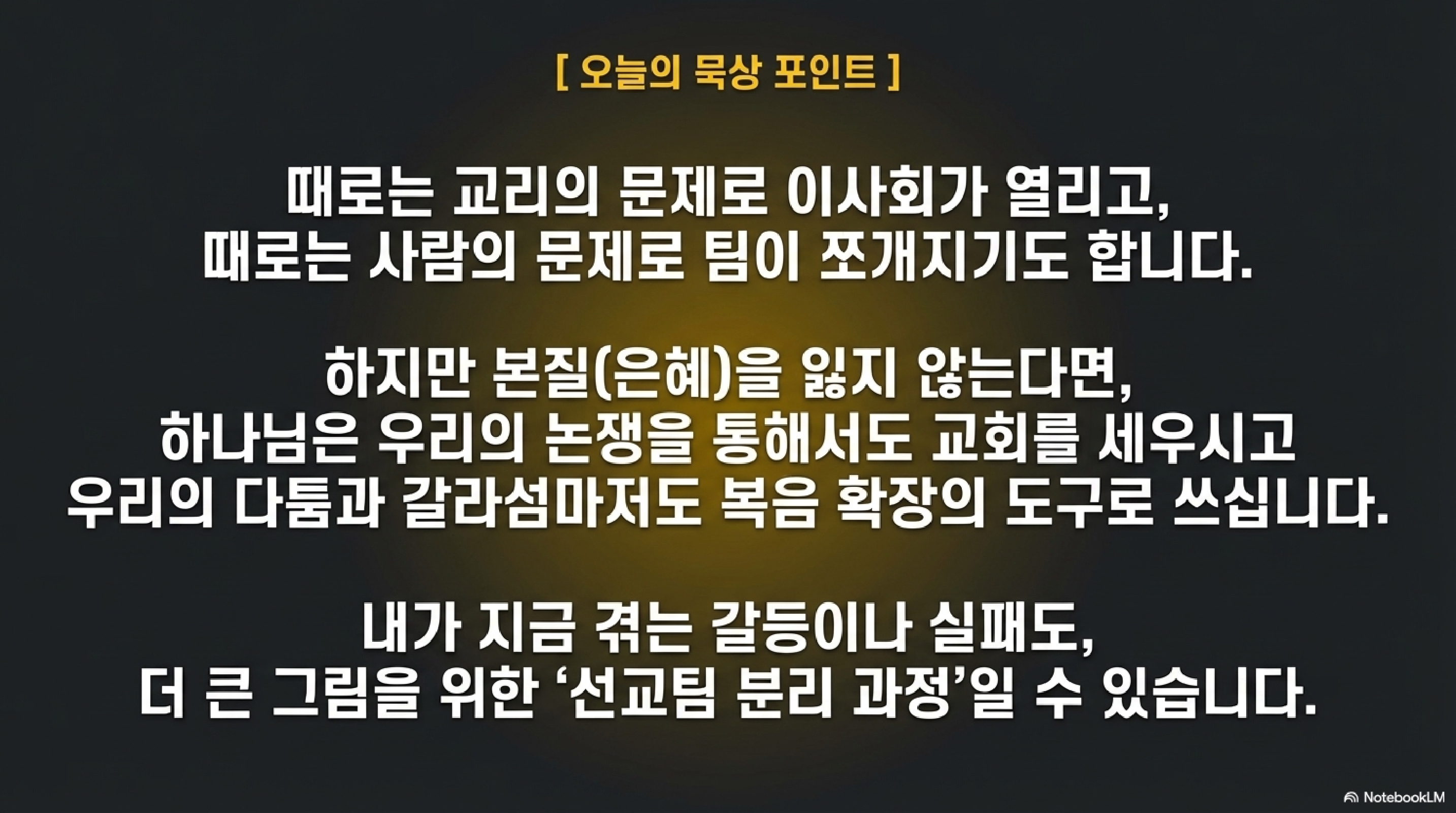 성경은 그들이 "심하게 다투어 갈라섰다"고 아주 드라이하게 기록합니다. 거룩한 사도들이라도 업무 스타일 안 맞으면 피 터지게 싸울 수 있다는 인간적인 위로를 줍니다. 하지만 결과가 압권입니다. 팀이 둘로 쪼개지면서 선교 노선은 두 배가 되었고, 결과적으로는 [멀티플라이(Multiply)]가 일어났습니다. 인간의 갈등마저 복음 확장의 레버리지로 쓰시는 하나님의 섭리가 참 오묘하죠?