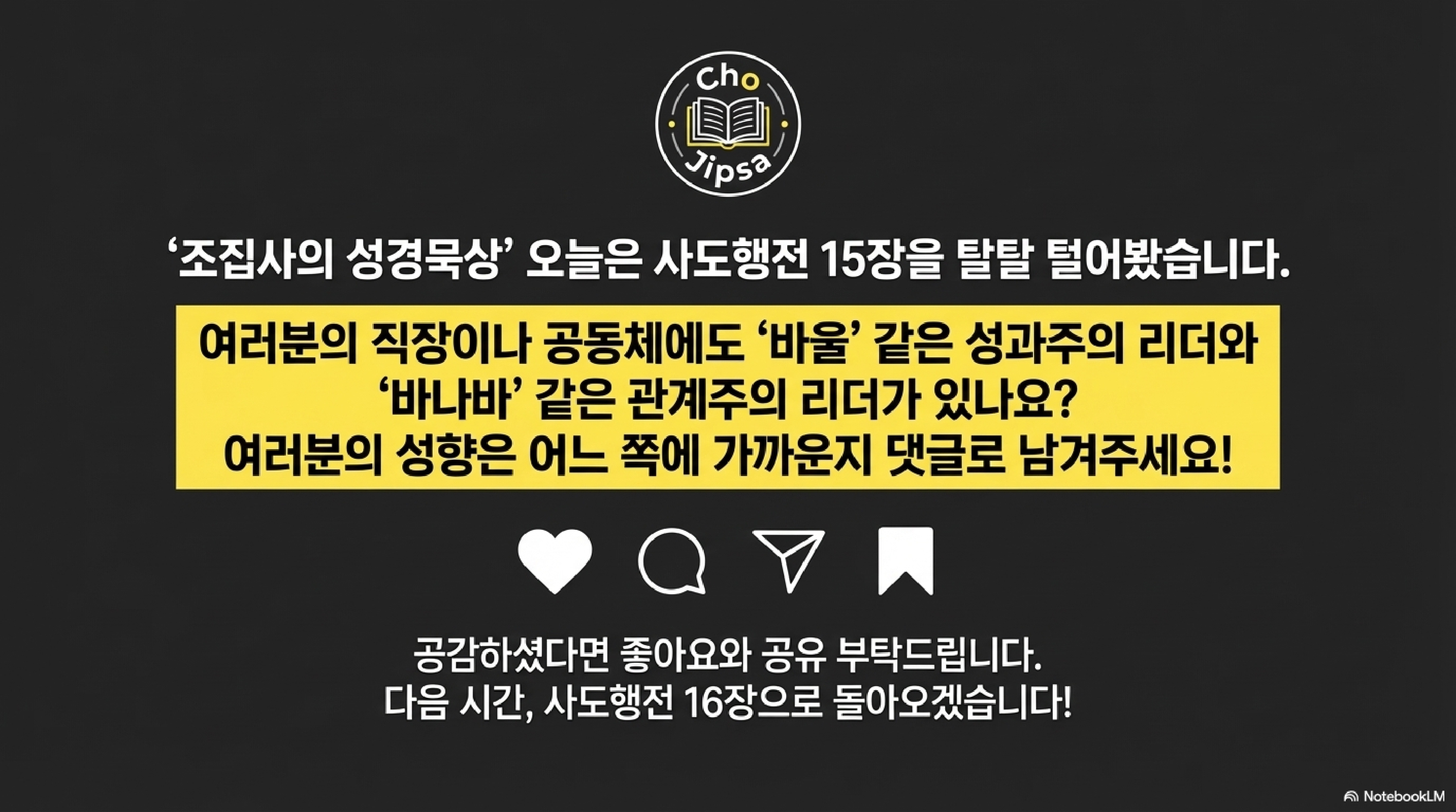 👩💼 오집사 : 와, 사내 정치란 이렇게 대의를 위해 아름답게 써먹어야 하는 거군요. 베드로가 거물급 방패가 되어 주니까, 온 회중이 쥐죽은 듯 조용해집니다. 그리고 나서야 비로소 바나바와 바울이 일어나서 현장에서 일어난 기적들을 쫙 브리핑하잖아요. 타이밍이 정말 기가 막히네요.