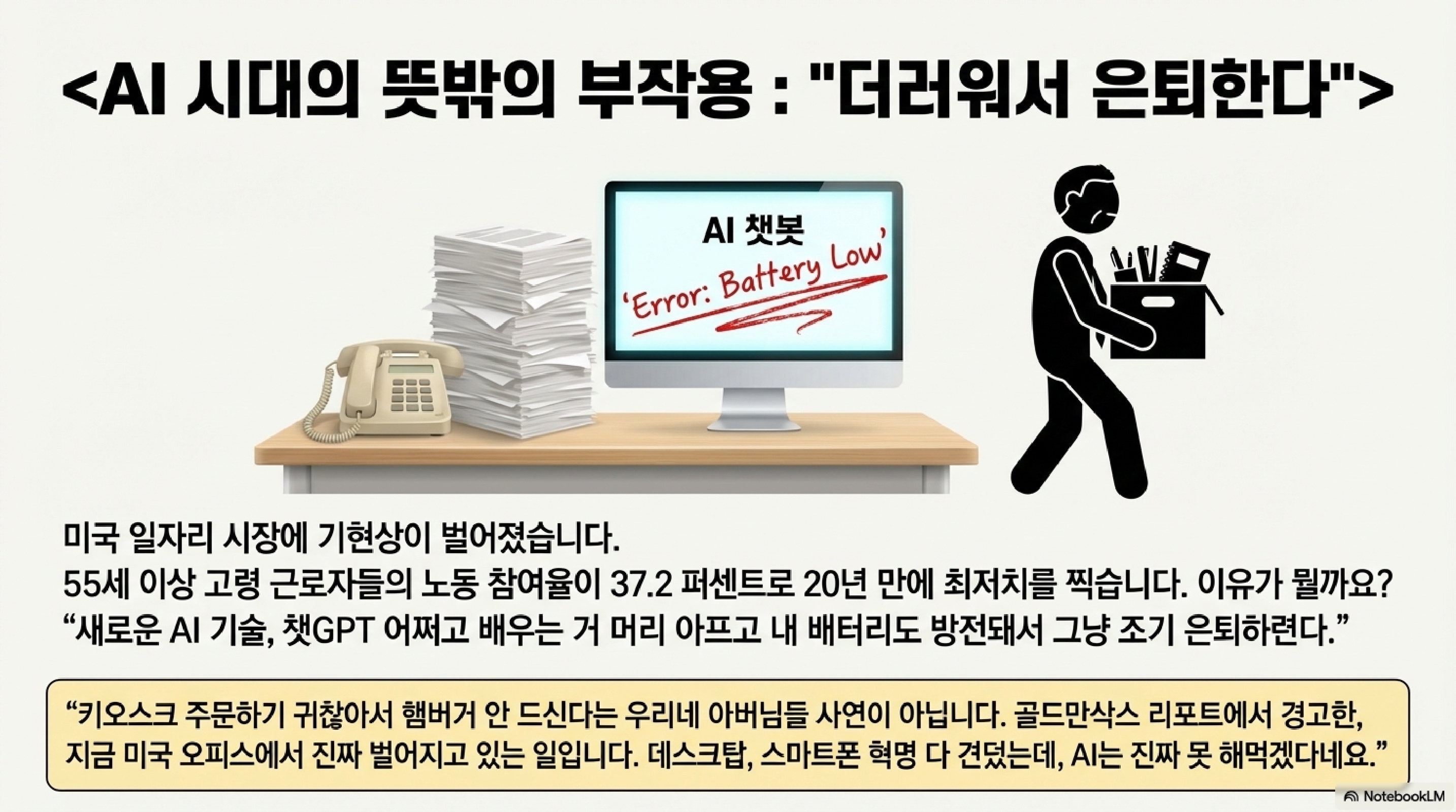 🎧 [오PD] : "내 배터리가 예전만큼 오래가지 않는다. 그러니까 새로운 AI 툴을 억지로 꾸역꾸역 배우고 프롬프트 창에 질문 입력하는 법을 배우느니, 차라리 미련 없이 퇴사하겠다는 겁니다."