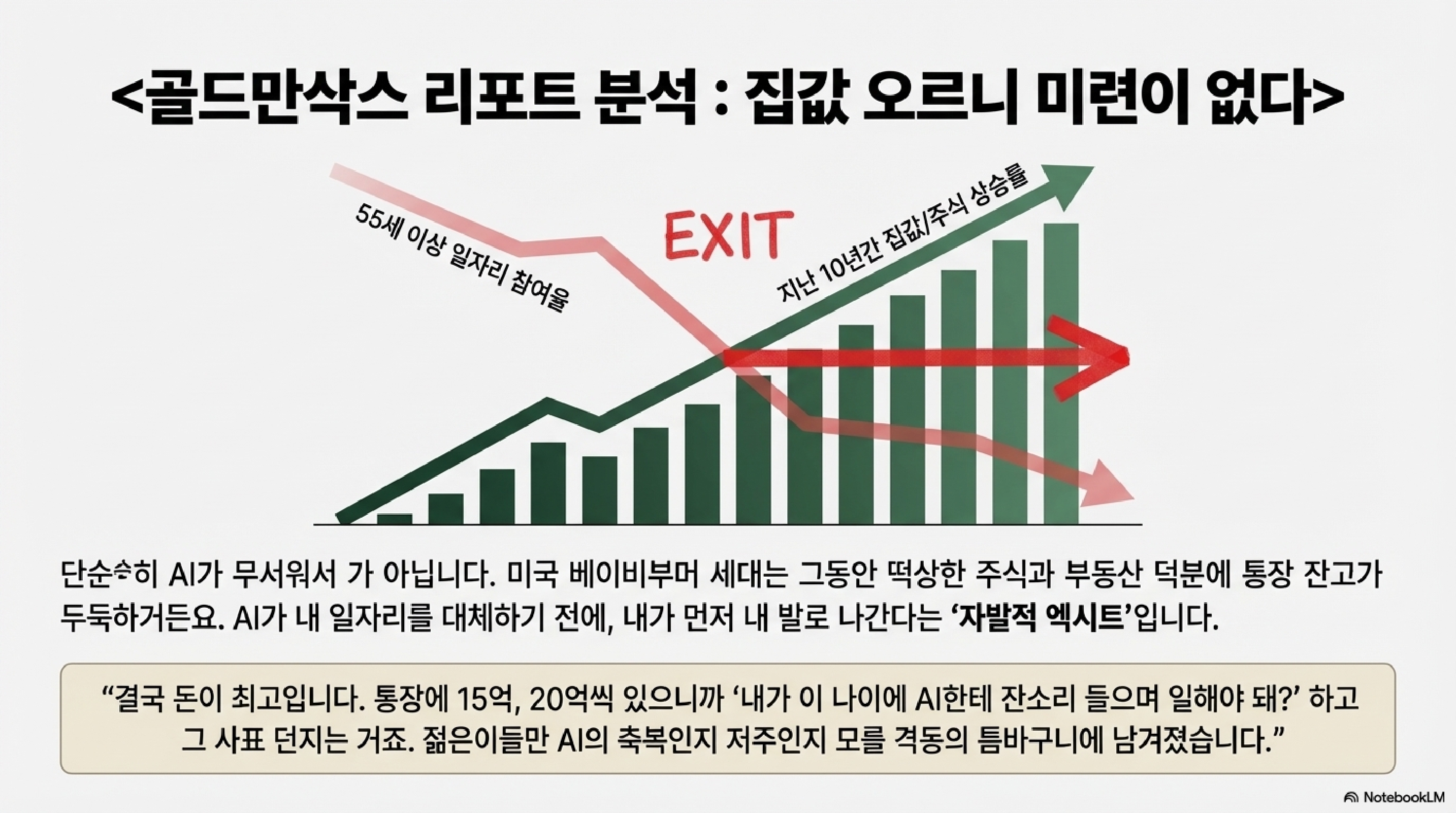 🎙️ [조PD] : "잠깐만요. 어, 제가 여기서 태클 하나 걸어볼게요. 그거 진짜 AI 때문 맞습니까? 냉정하게 말해서 지난 몇 년간 코로나 터지고 미국 증시 완전 날아갔잖아요. 집값도 두세 배씩 막 뛰었고요. 55세 이상 베이비부머들이나 X세대들이 '아, 내 연금 계좌랑 집값 보니까 이제 굳이 뼈 빠지게 출근 안 해도 평생 골프나 치며 먹고살겠다' 이래서 자발적으로 파이어족 선언하고 나간 거 아닙니까? 자산 시장 호황 때문이지 AI 때문이라고 핑계 대는 건 좀 오버 같은데요?"