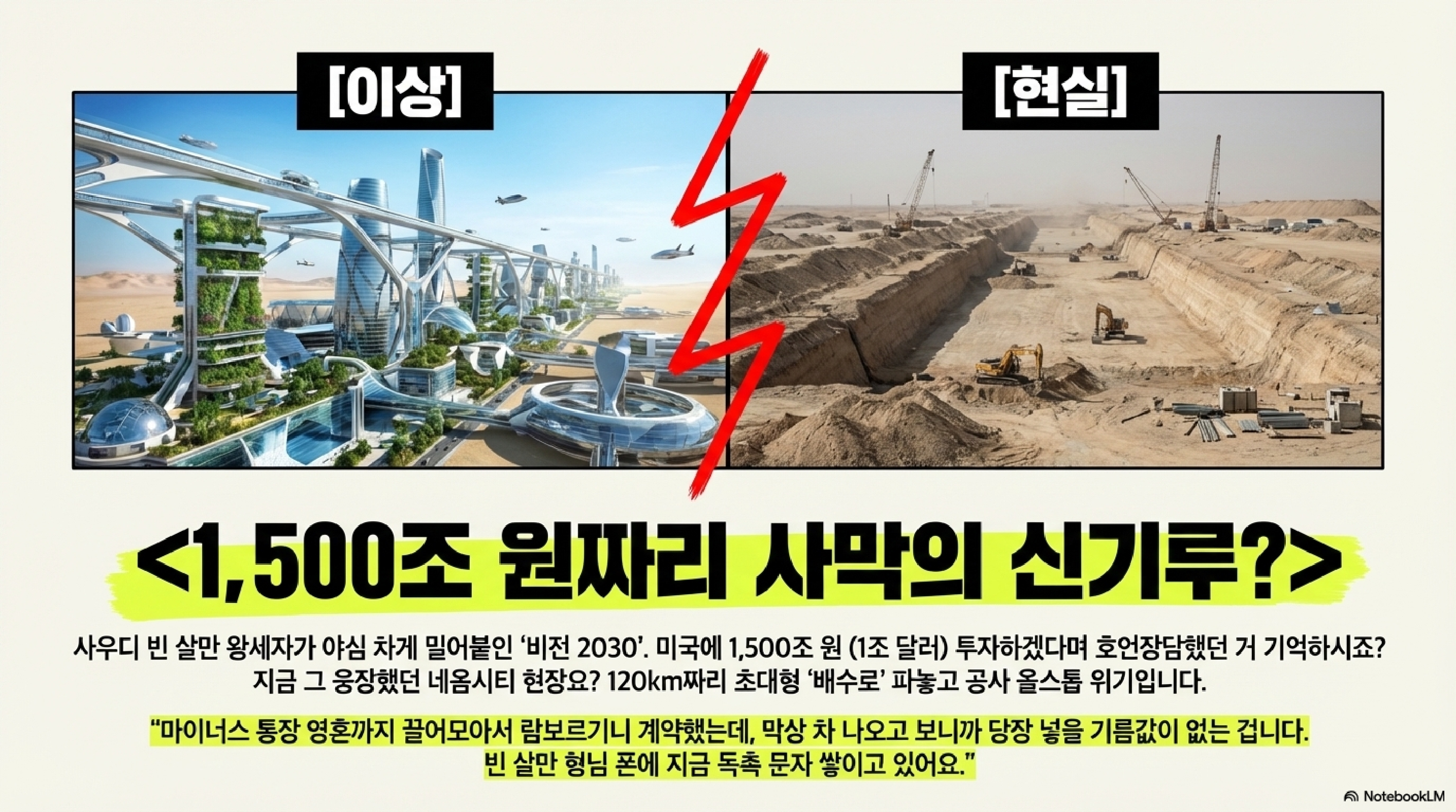 🎧 [오PD] : "네, 멈췄죠. 120km가 넘는 엄청난 참호만 사막에 쫙 파놓고, 지금 거기로 모래바람만 다시 채워지고 있답니다. 거기다가 57조 원 규모의 산악 스키 리조트, 이거는 아예 건설 계약 자체가 취소됐고요."