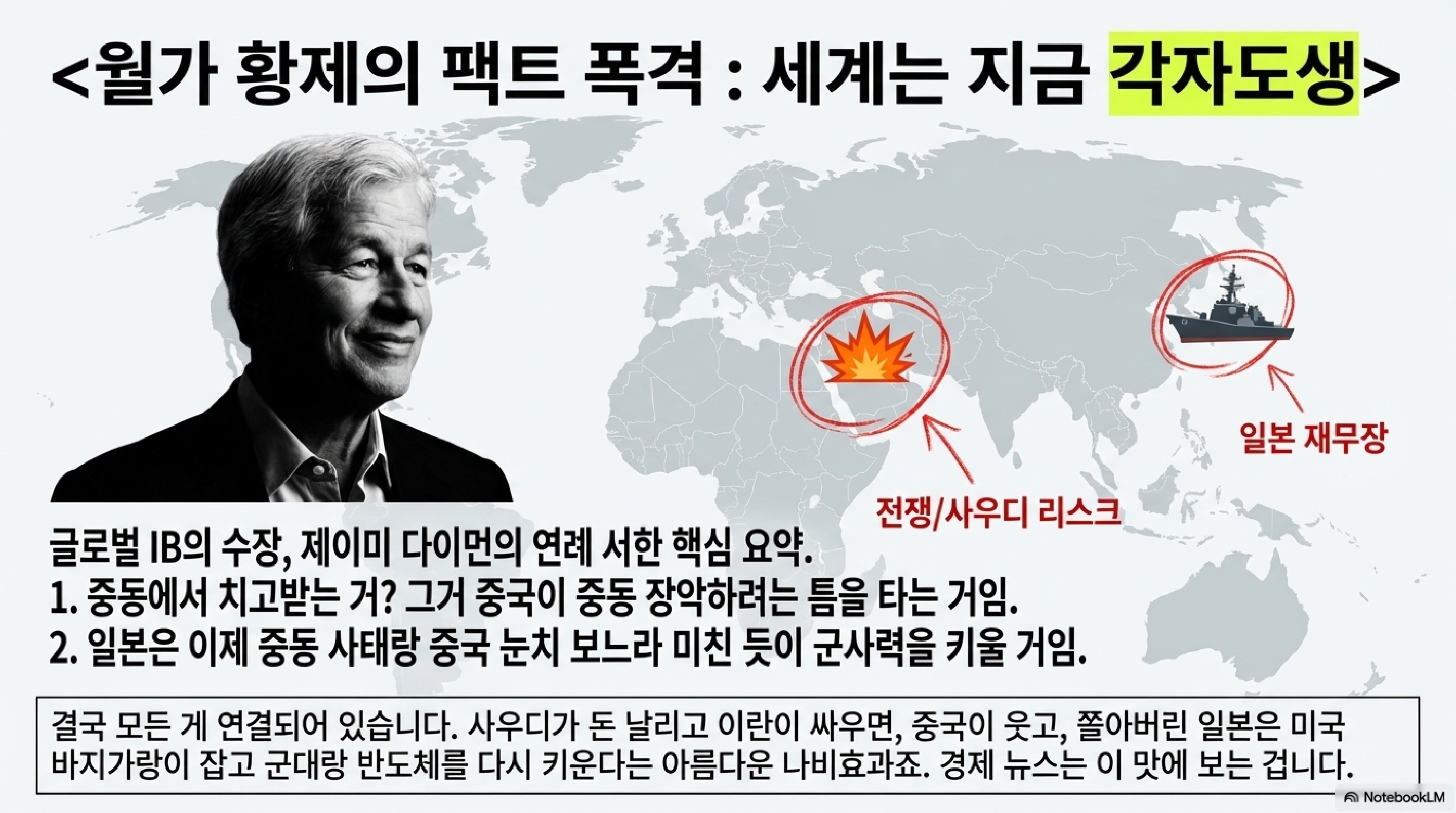 🎧 [오PD] : "맞습니다. 남은 90%를 차지하기 위한 패닉 바잉이 확 겹치면서 가격이 기하급수적으로 폭등하죠. 당장 미국 내 휘발유 가격이 갤런당 4.12달러를 뚫었고요, 아시아 공장들은 마진을 맞출 수가 없어서 기계 전원을 아예 끄고 있습니다. 주요 외신들 보니까 JP모건의 제이미 다이먼 CEO가 이 상황을 아주 찰떡같이 묘사했더라고요."