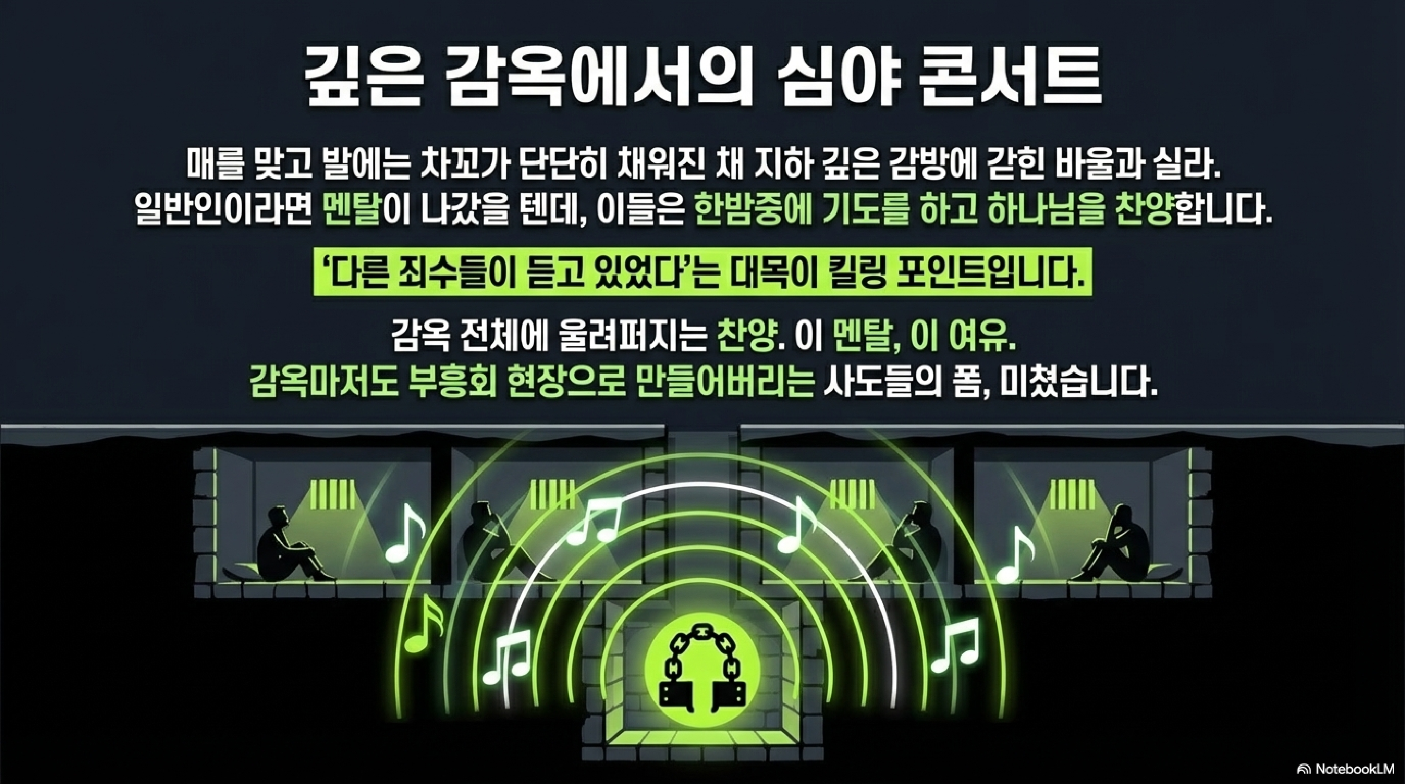어 물리적인 지표로만 보면 가장 깊은 절망의 밑바닥이 맞습니다. 하지만 텍스트는 이 극단적인 한계 상황에서 바울과 실라가 도저히 상식적으로 해석할 수 없는 행동 패턴을 보인다고 기록합니다.