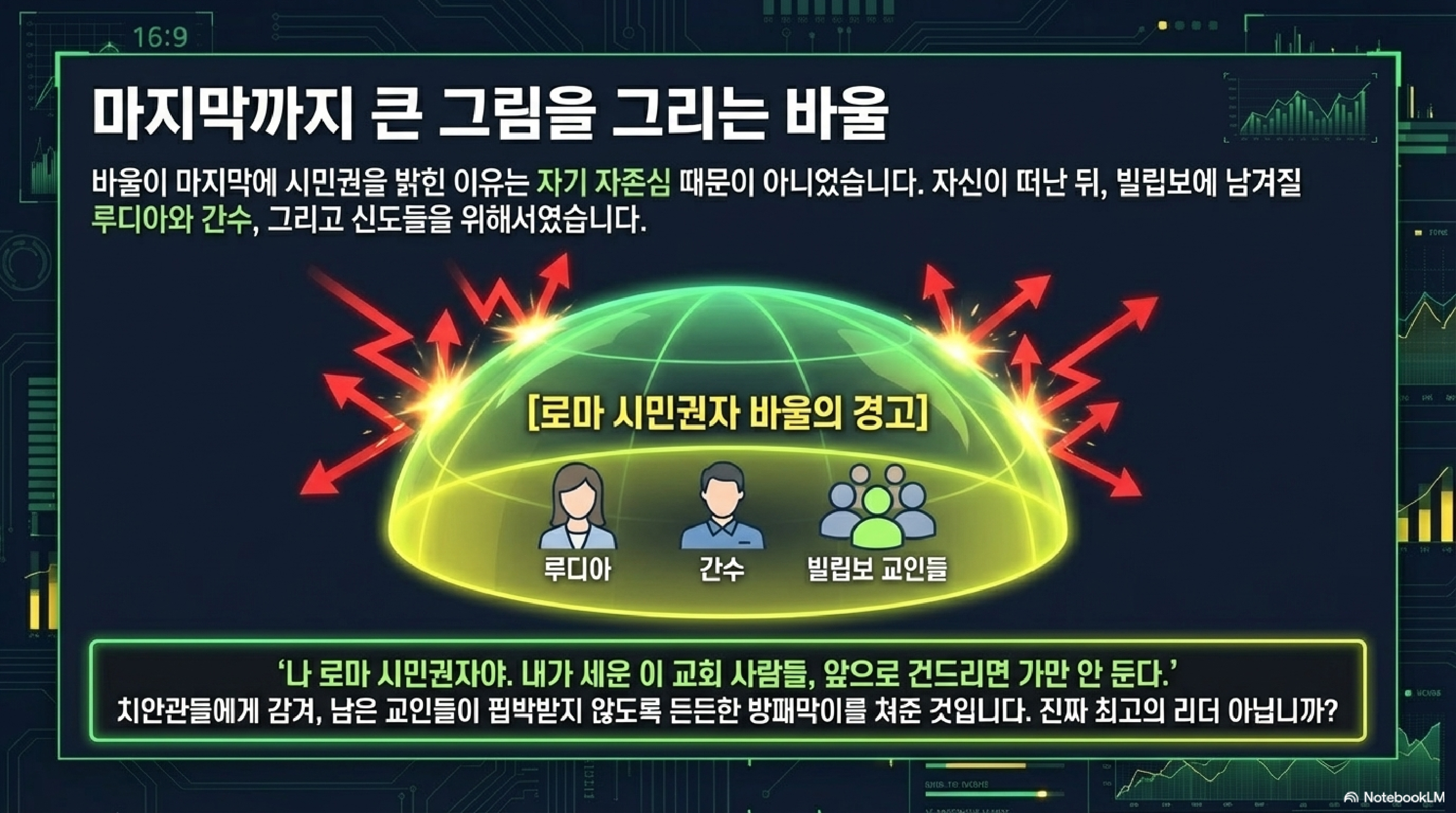 모든 고통을 감내한 후 꺼내든 로마 시민권 카드가 단순한 생존 카드가 아닌 남겨진 성도들을 위한 강력한 정치적 알박기였음을 보여줍니다. 공권력을 향한 치밀한 기싸움을 통해 완벽한 법적, 정치적 방어벽을 구축한 바울의 천재적 전략을 감상할 수 있습니다.