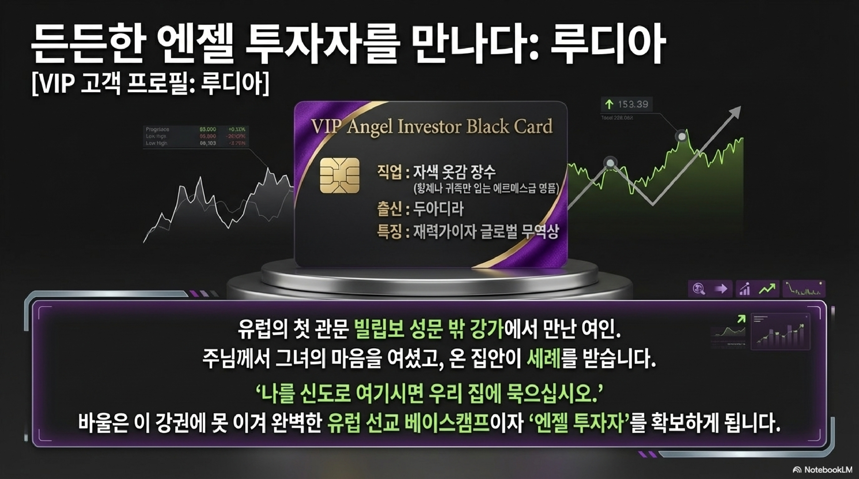 네. 아시아 진출을 막으면서까지 방향을 틀어 만나게 한 첫 번째 핵심 인물, 바로 루디아입니다. 직업이 무려 자색 옷감 장수예요. 당시 자색 옷감이면 엄청난 하이엔드 럭셔리 비즈니스 아닙니까? 단가랑 마진율이 어마어마한 명품 시장의 큰손을 우연히 강가에서 딱 마주친 겁니다.