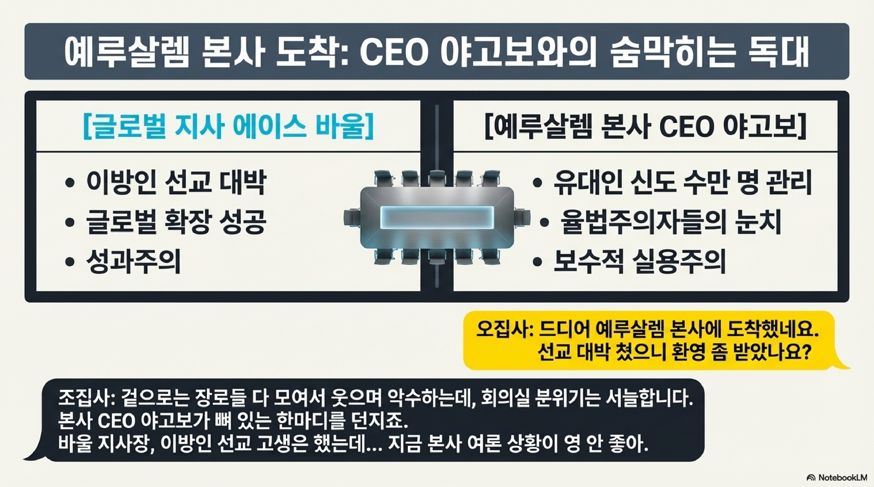 - 예루살렘 본사에 금의환향한 바울을 기다리고 있던 것은 환영 파티가 아니라, 내부 동역자들의 끔찍한 사내 정치와 가짜 뉴스였습니다.
