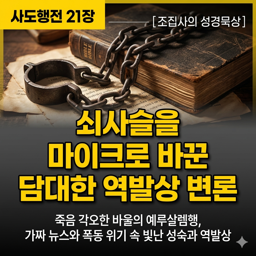 오늘의 심층 분석 이제 마무리할 시간입니다 구구절절한 요약은 하지 않겠습니다 주변 동료들의 눈물 어린 만류 억울한 교회 내 가짜 뉴스 사지가 찢길 뻔한 성전 폭동의 한가운데서도 기어코 그 병영 계단 위에 꼿꼿이 서서 피 흘리며 입을 여는 바울의 뒷모습을 시청자들께서 가만히 그려보시기 바랍니다 우리 삶에 억울함이나 거센 위기가 닥칠 때 과연 안전하게 숨을 곳을 찾을 것인지 아니면 나만의 계단 위에 올라서 그곳을 사명적인 무대로 만들어낼 것인지 그 묵직한 여운을 남기며 오늘 방송 마칩니다 지금까지 조집사의 성경 묵상이었습니다.