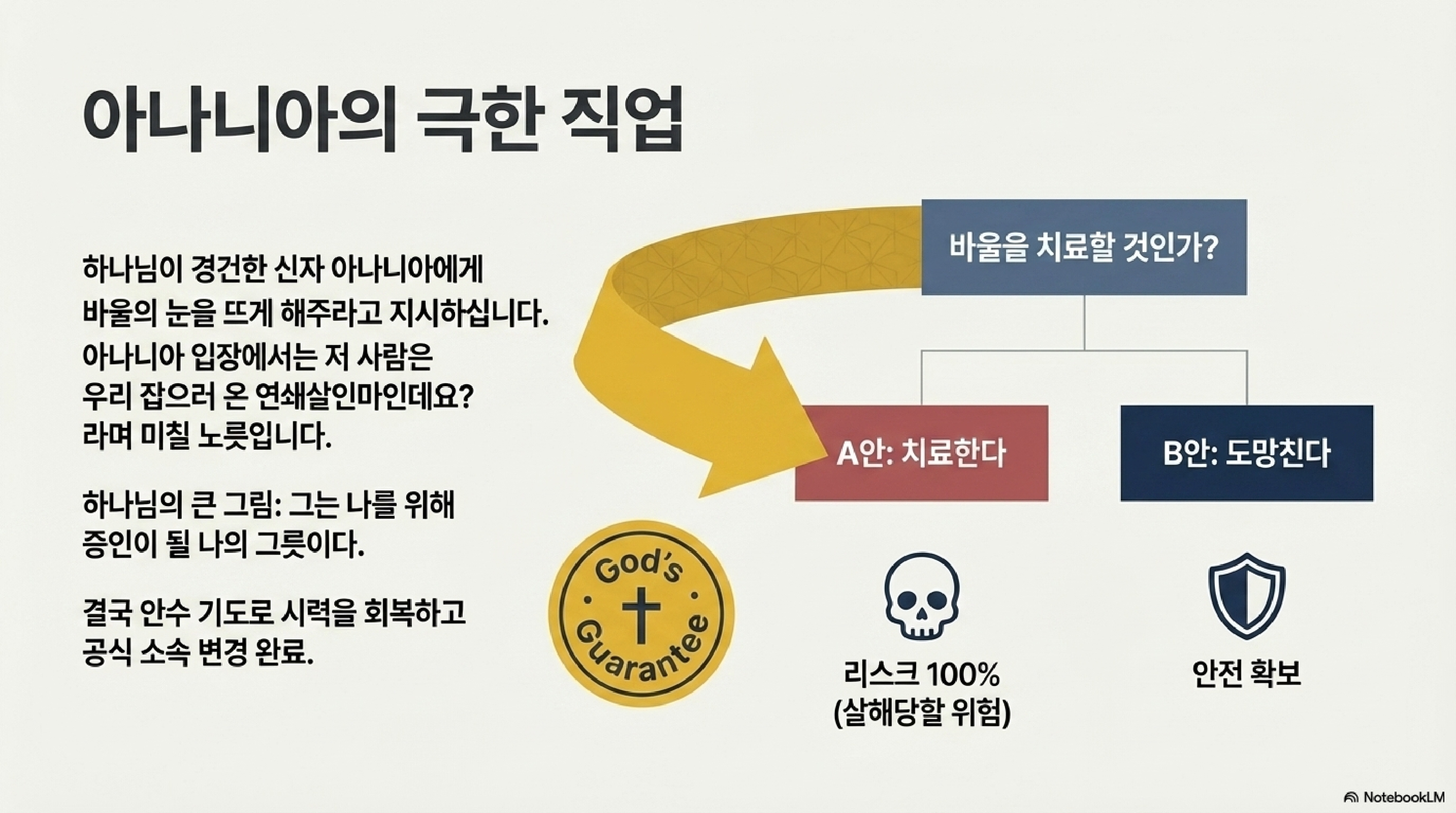 - 자신이 박해하던 대상(아나니아)에게 안수를 받는 역설적 과정을 통해, 바닥까지 부서진 후에야 영적인 눈을 뜨게 됨을 증명합니다.